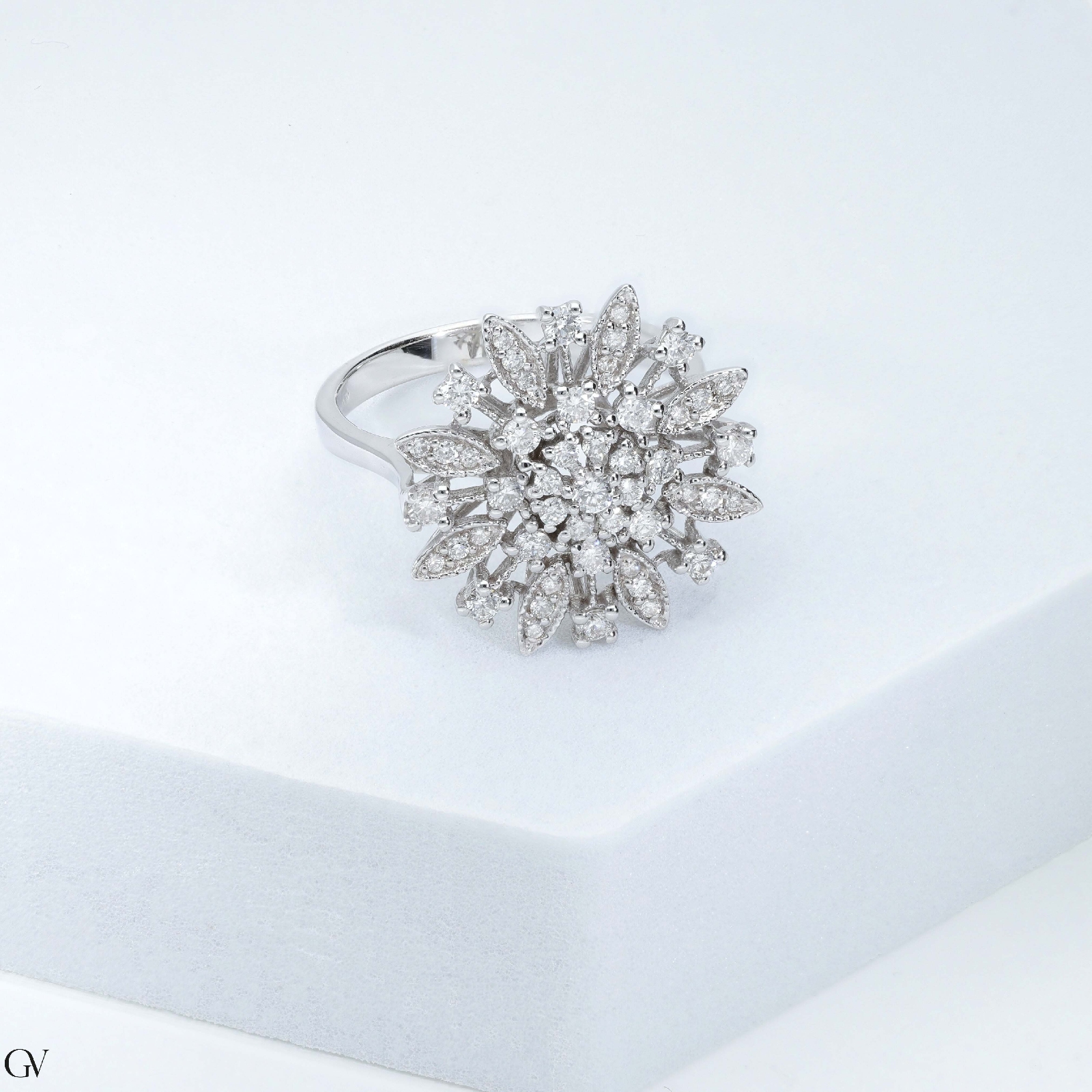 Bague fleur en or blanc 18K avec diamants brillants