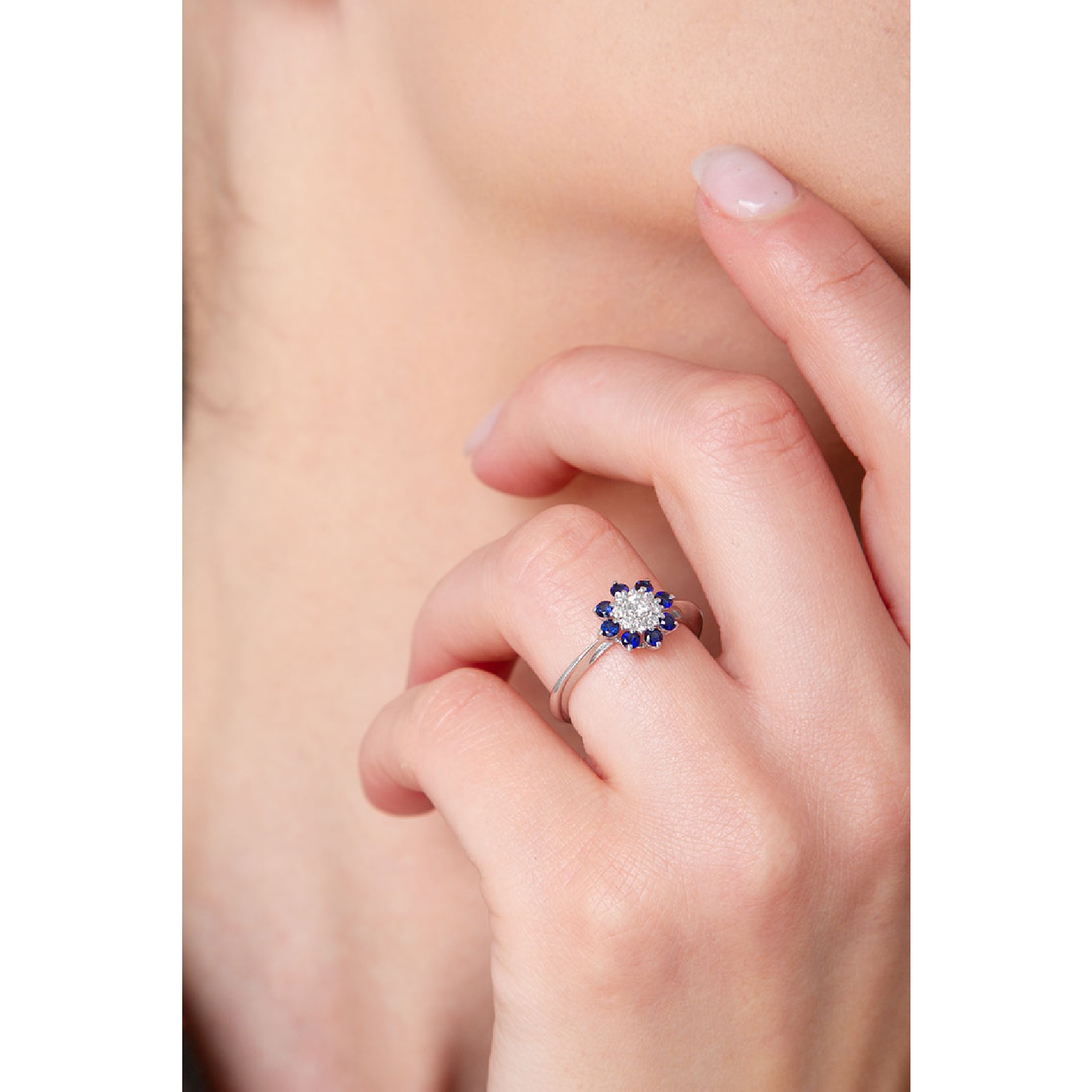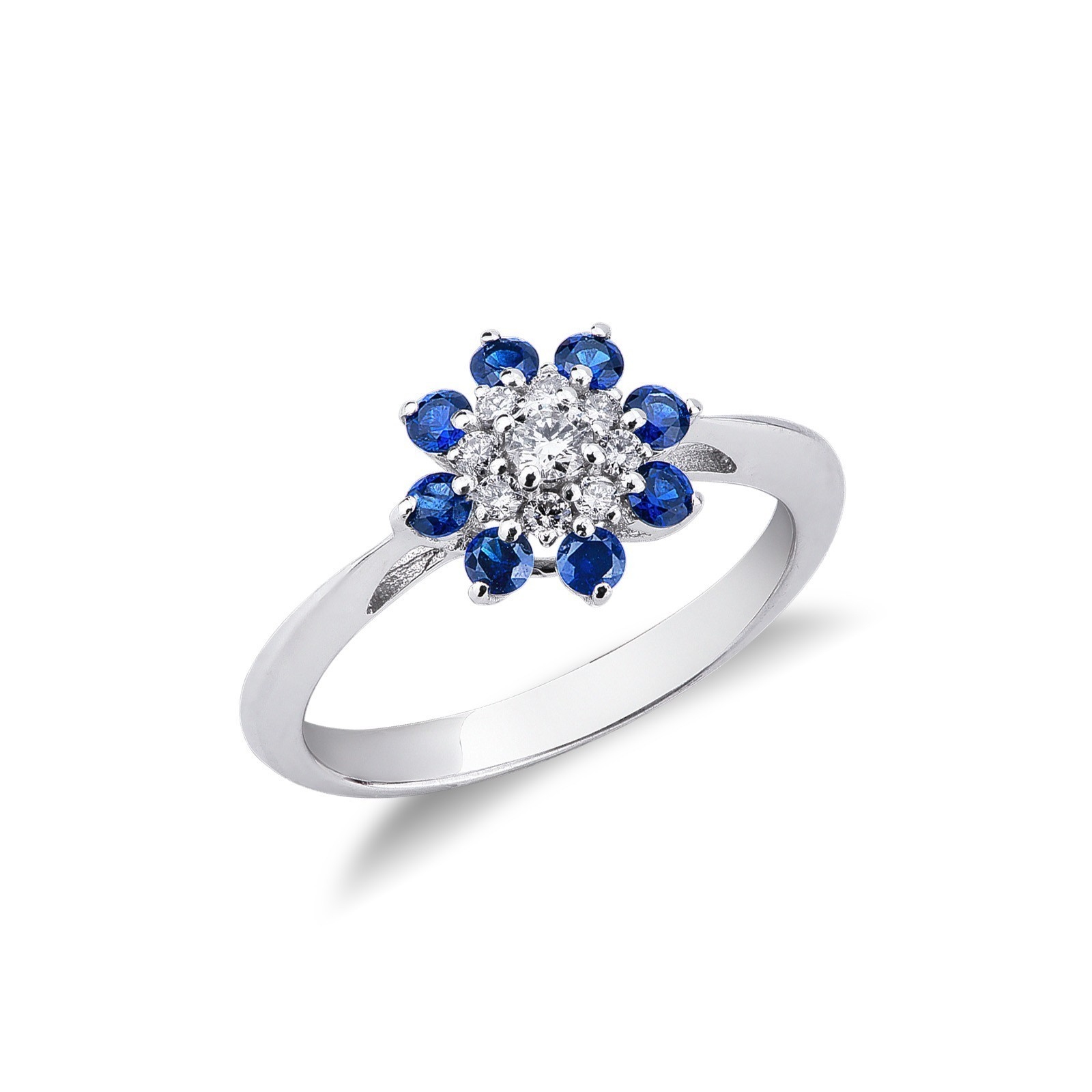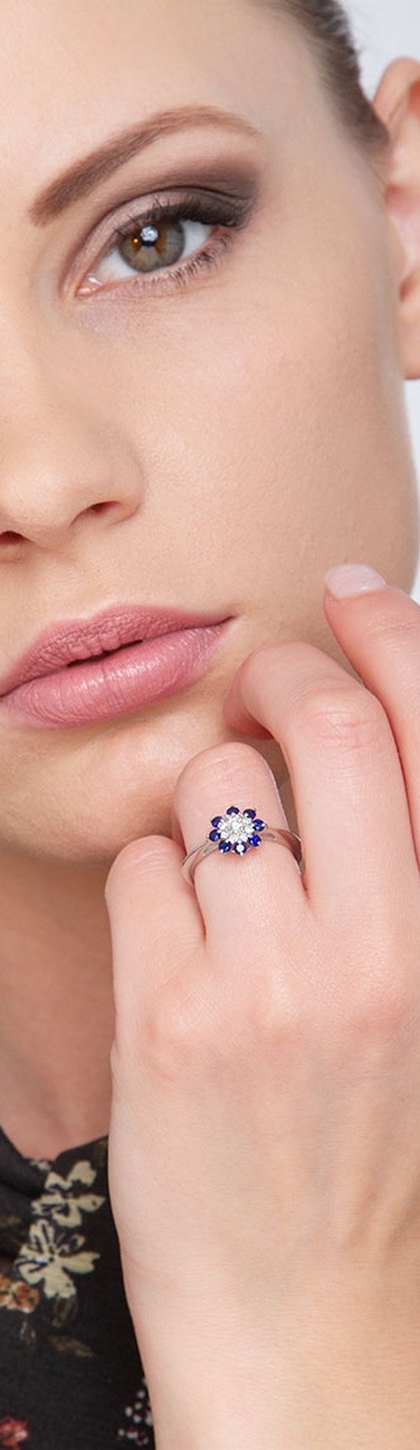 Bague fleur Or Blanc 18k avec Diamants et Saphirs Bleus