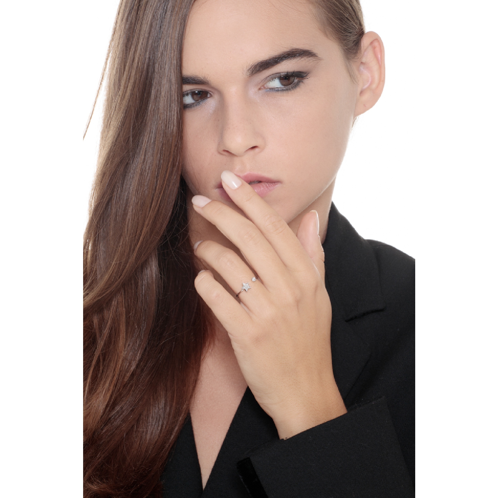 Bague ouverte en or blanc 18 carats avec motif étoile et point de lumière, sertis de diamants taille brillante, couleur H et pureté VS. Un bijou au design moderne et lumineux, alliant élégance et symbolisme dans une création raffinée et polyvalente. Idéale à porter au quotidien ou à offrir en cadeau, parfaite pour celles qui apprécient les détails délicats et le style contemporain.