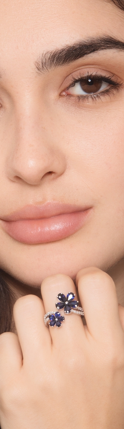 Bague ouverte en or blanc avec double fleur, saphirs et diamants