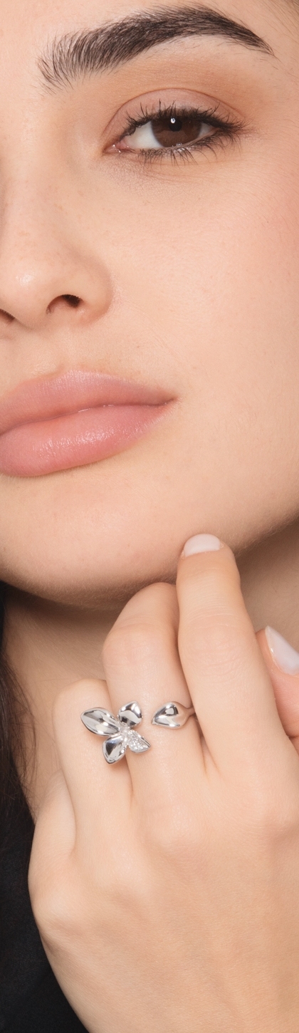 Bague ouverte fleur en or blanc et diamants