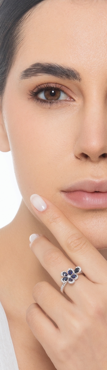 Bague saphir bleu et diamant fleur or blanc