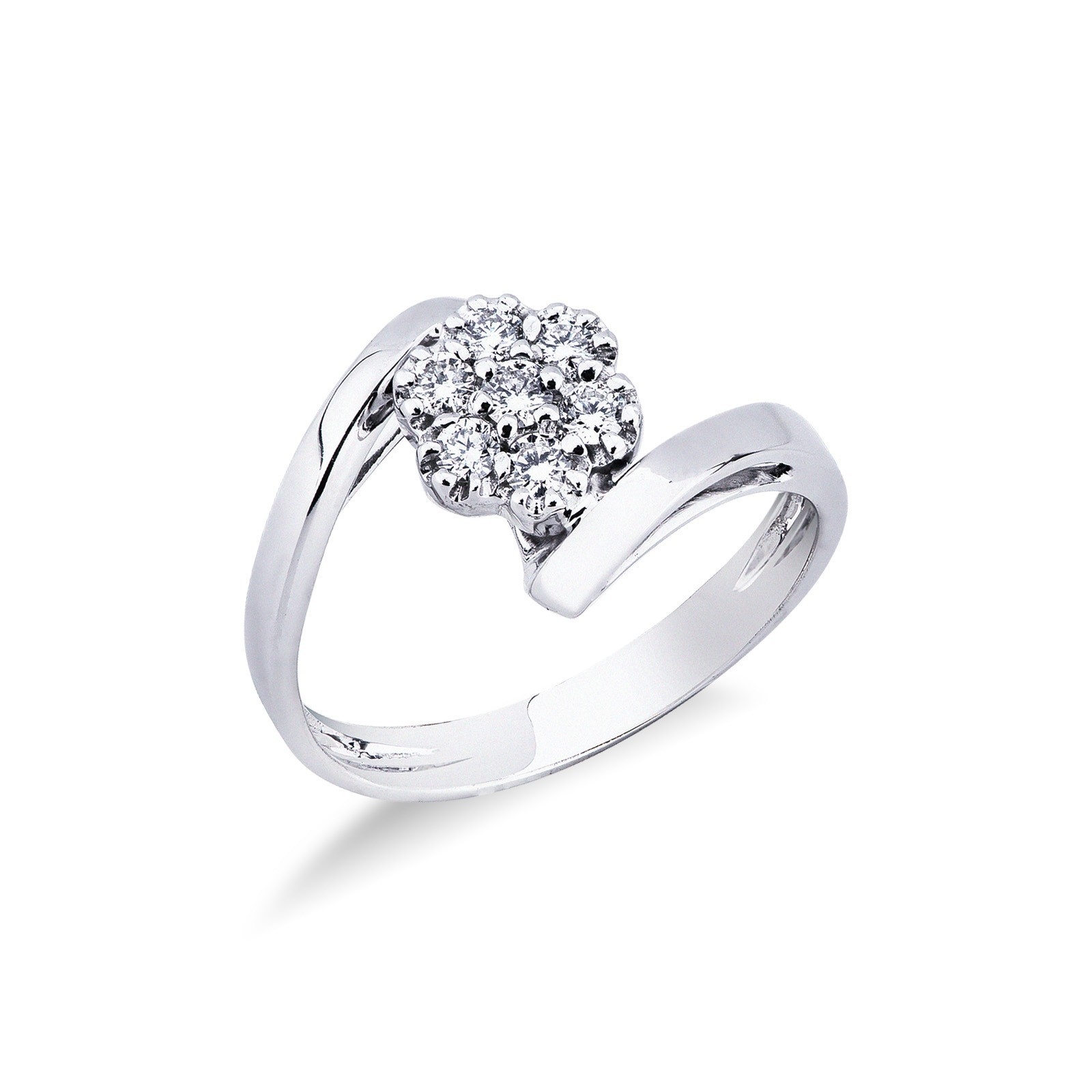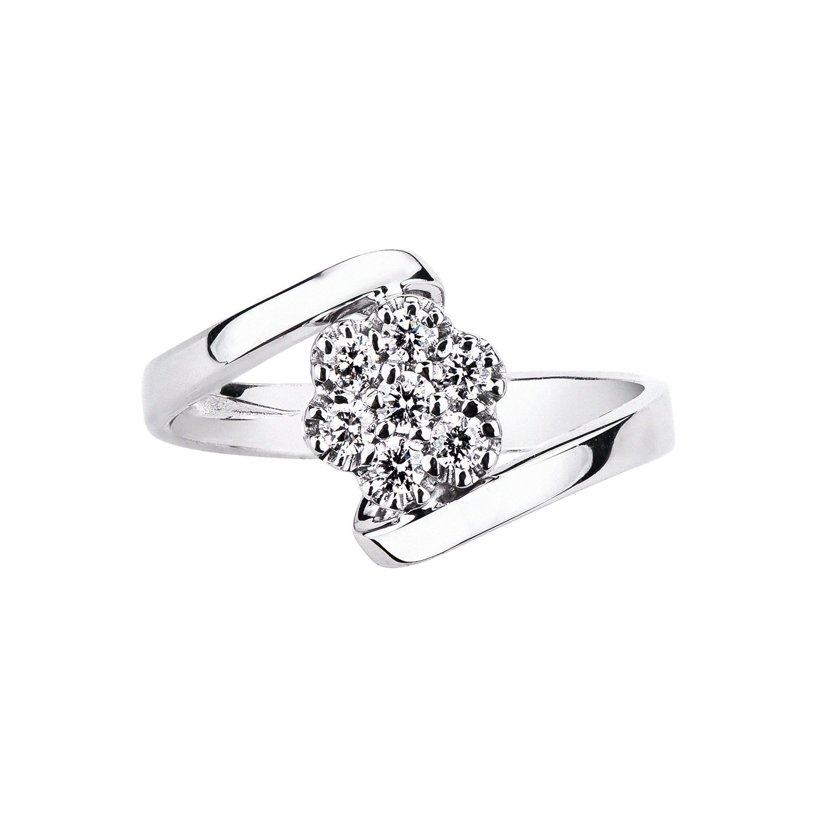 Une vague de lumière autour du doigt. Cette bague illusion en or blanc 18 carats séduit par sa forme contrarié fluide, sertie de diamants taille brillant couleur H pureté VS. Une pièce moderne au charme magnétique.