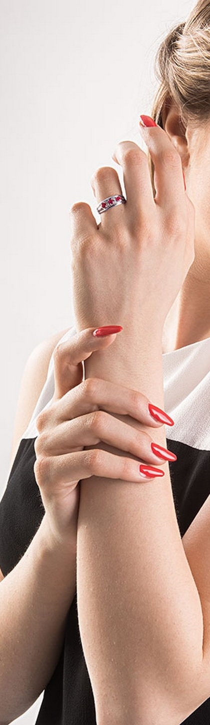 Bague trilogie en Or Blanc 18k avec trois rubis taille brillant, alternés avec des diamants taille brillant, couleur H et pureté VS. Le contraste entre le rouge profond des rubis et l’éclat des diamants crée un bijou élégant et raffiné, parfait pour celles et ceux qui recherchent un design classique avec caractère et distinction.