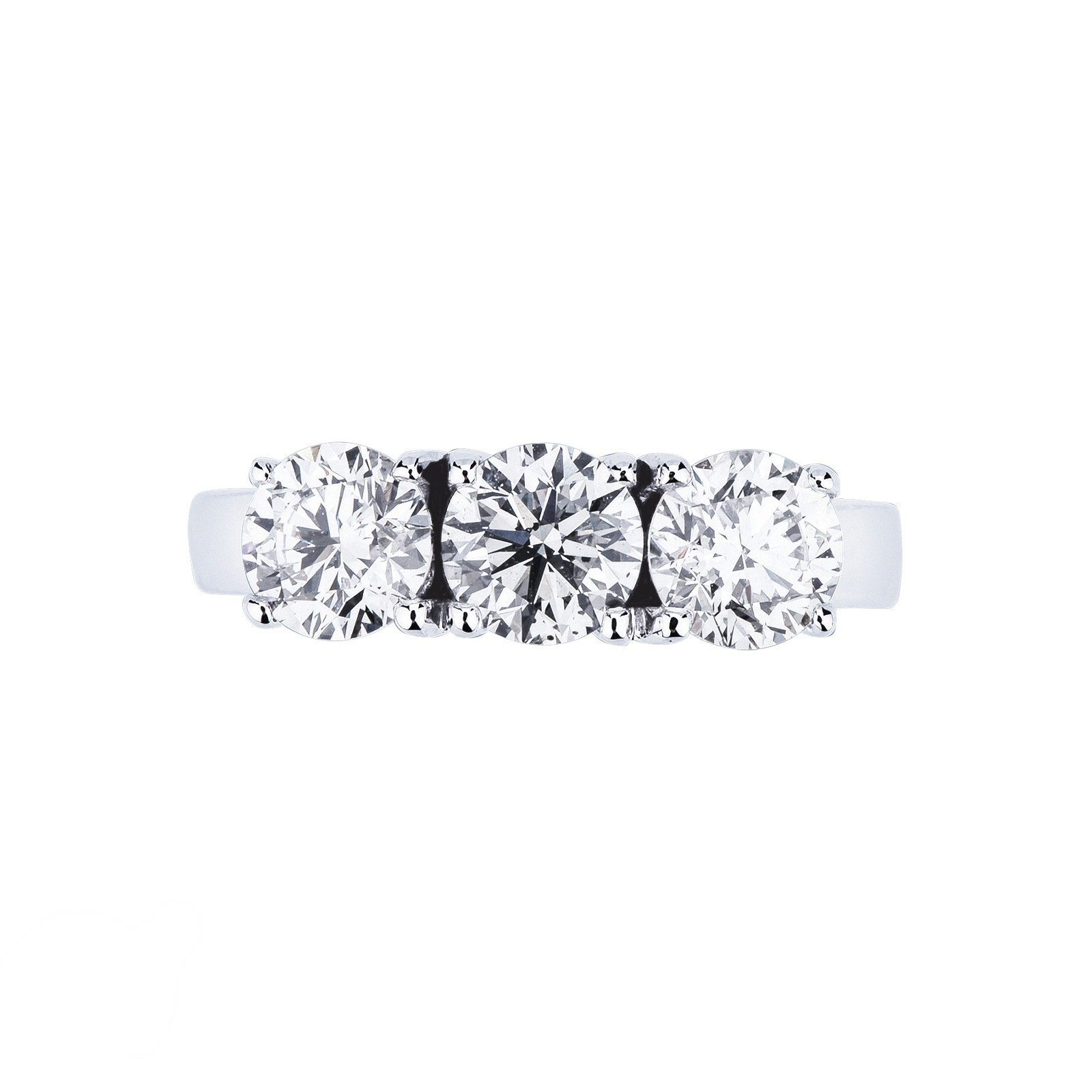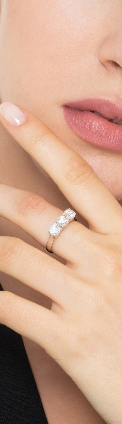 Bague Trilogy en or blanc 18 carats, sertie de diamants taille brillant pour un poids total de 1,70 carat, de couleur H et pureté VS. Un bijou raffiné et lumineux, symbole d’amour éternel, idéal comme bague de fiançailles, de célébration ou pièce de haute joaillerie. Son design élégant met en valeur l’éclat naturel des diamants et assure une brillance exceptionnelle au quotidien.