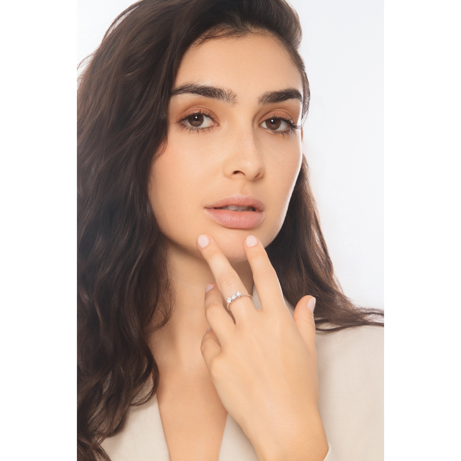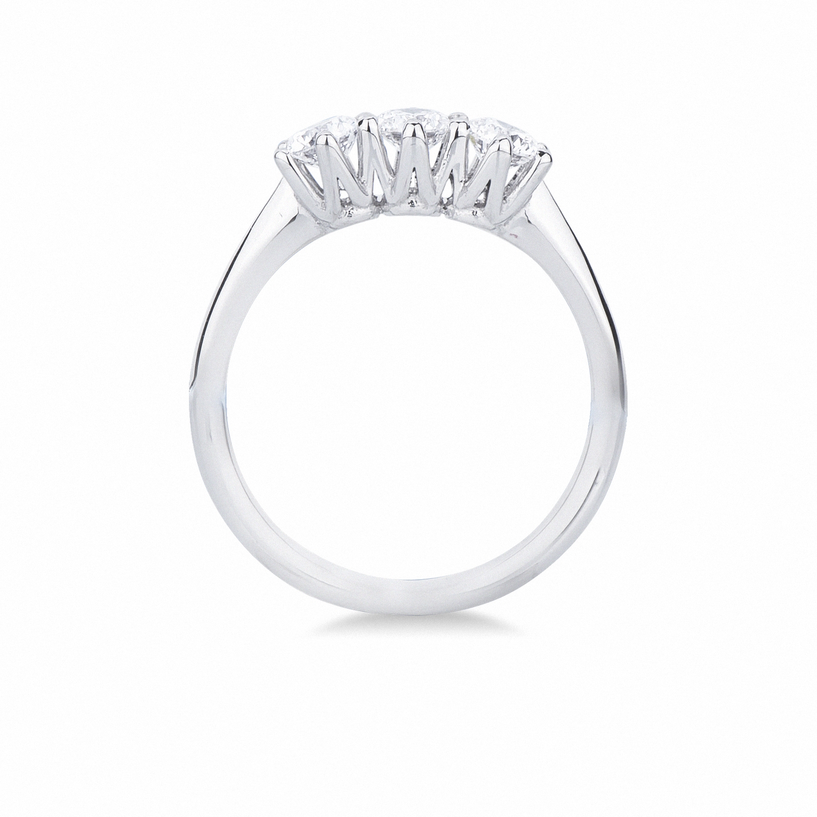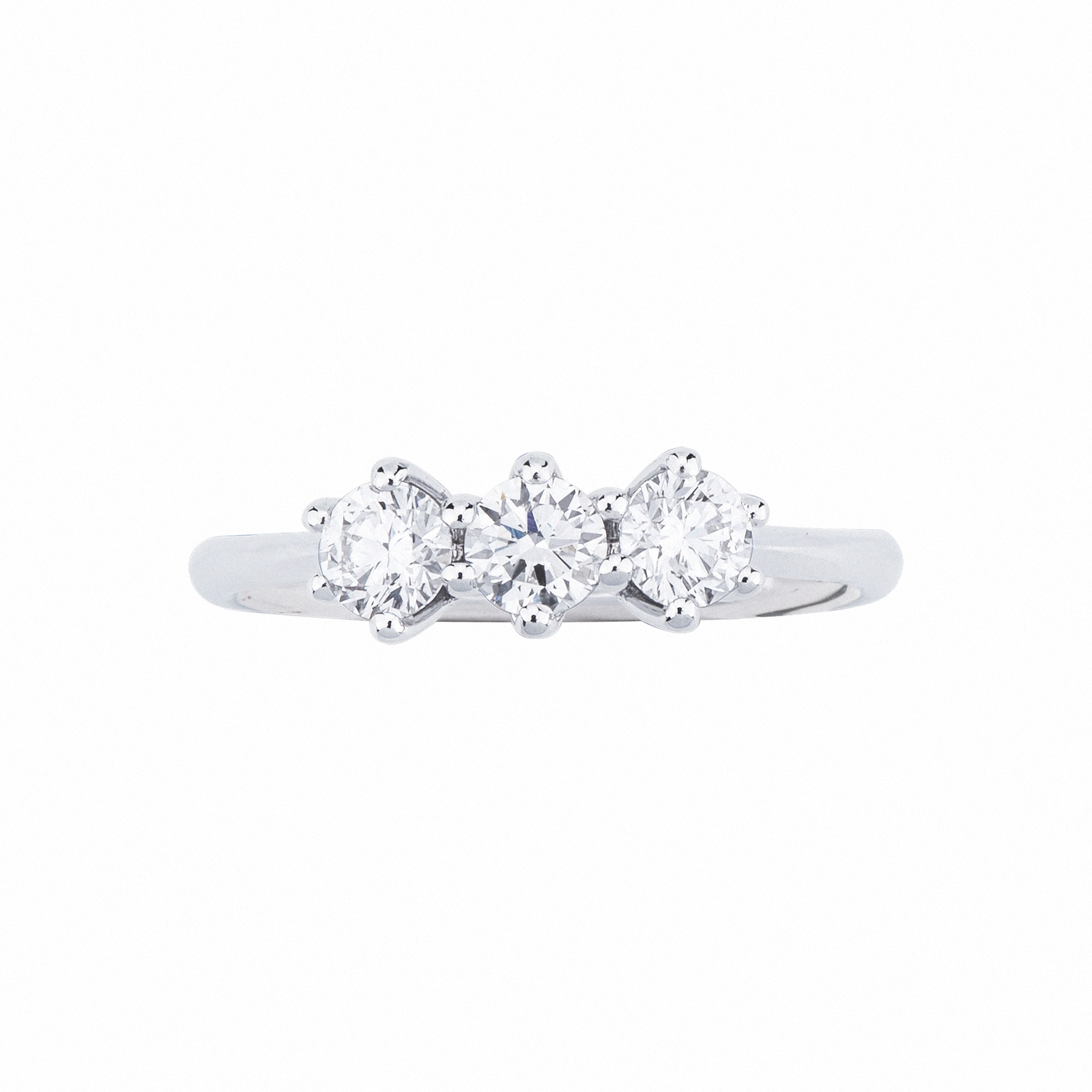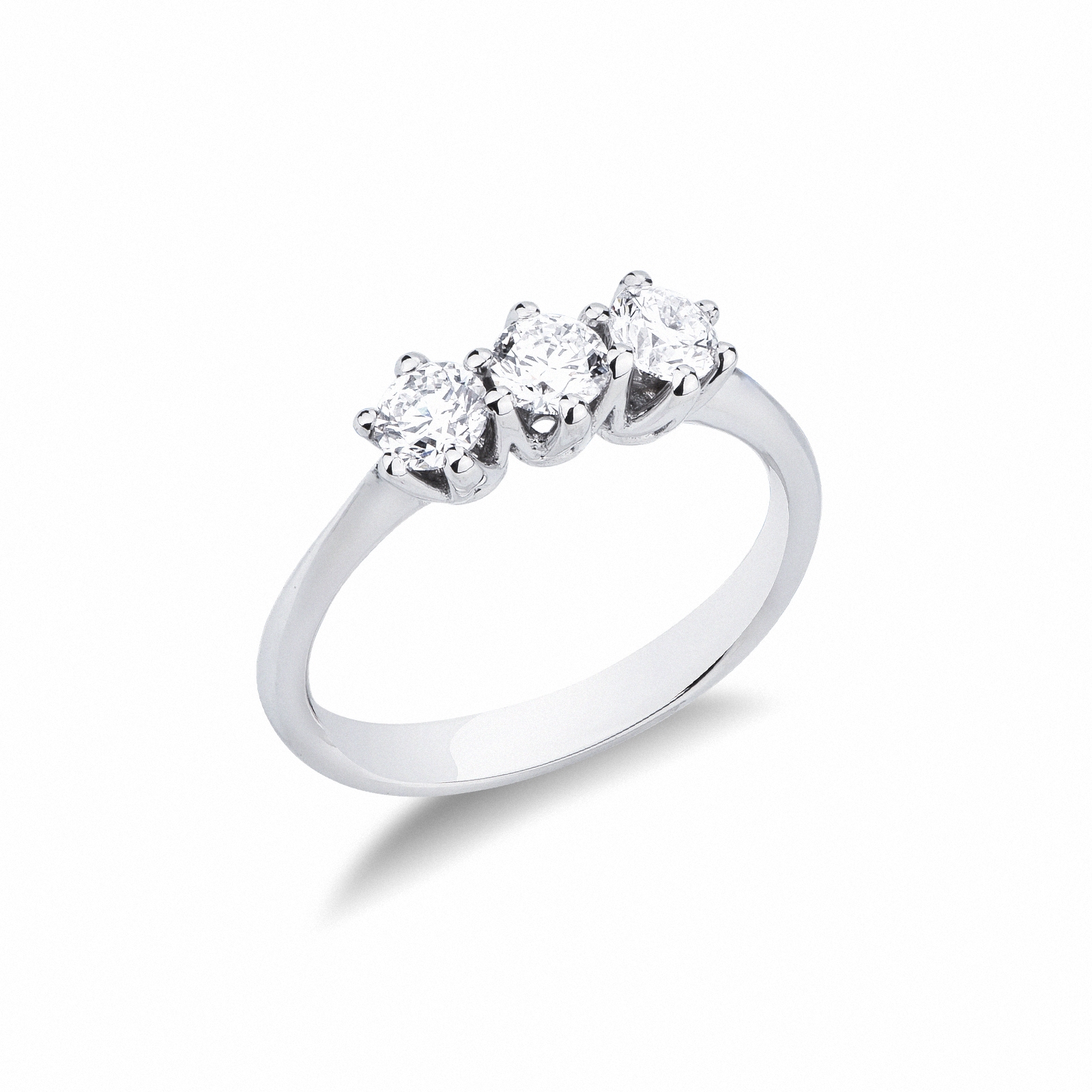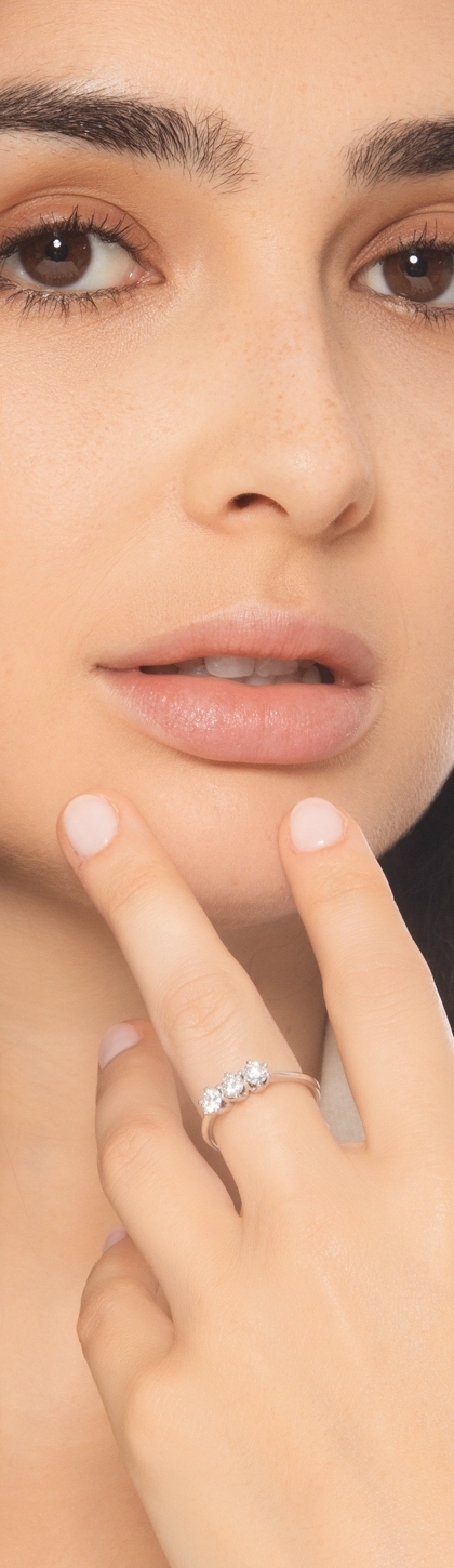Bagues en or blanc 18 carats, serties de trois diamants taille brillant, couleur H et purete VS. Un design classique et intemporel qui symbolise l’amour a chaque etape de la vie