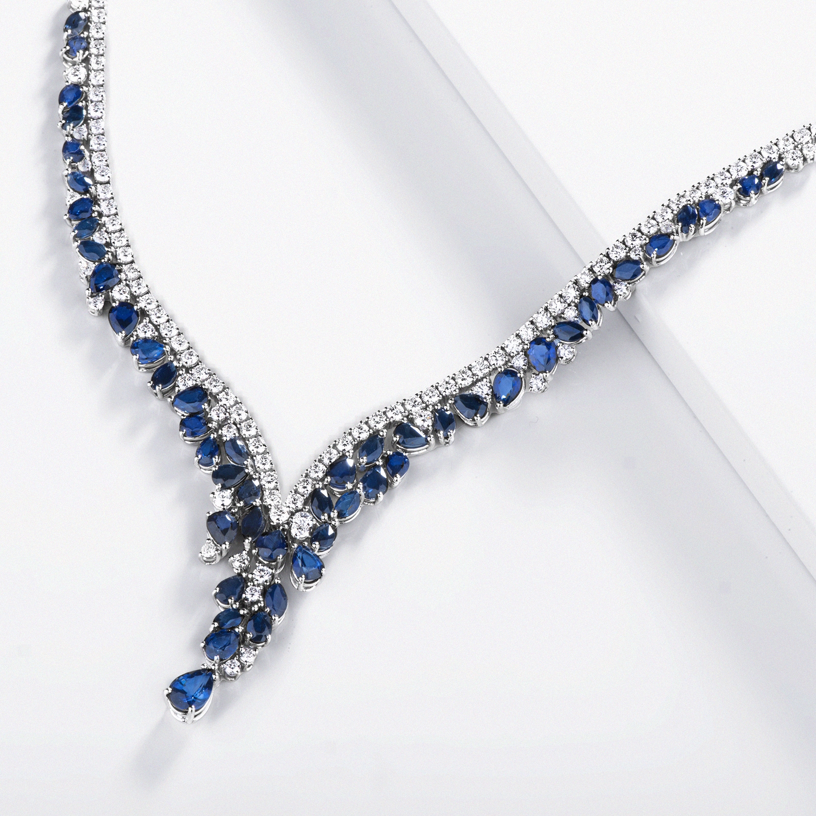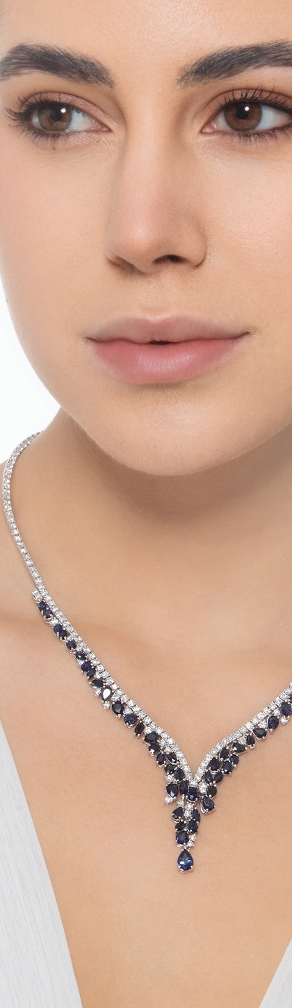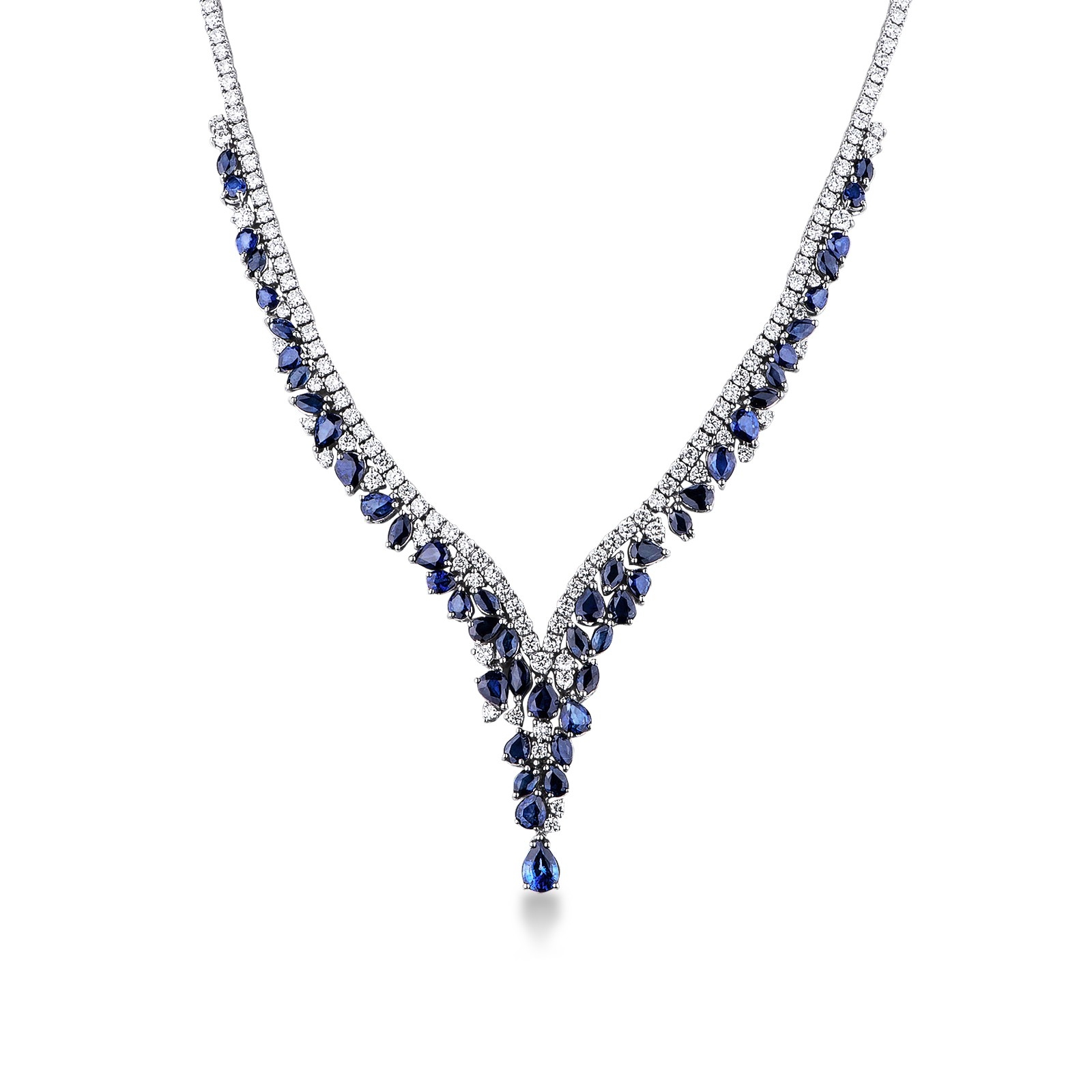 Collier en Y cascade en or blanc 18k avec saphirs bleus goutte et diamants