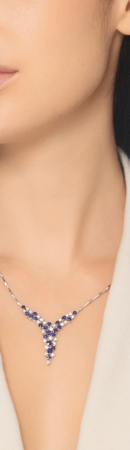 Collier en Y semirigide en or blanc 18k avec cascade de saphirs bleus et diamants