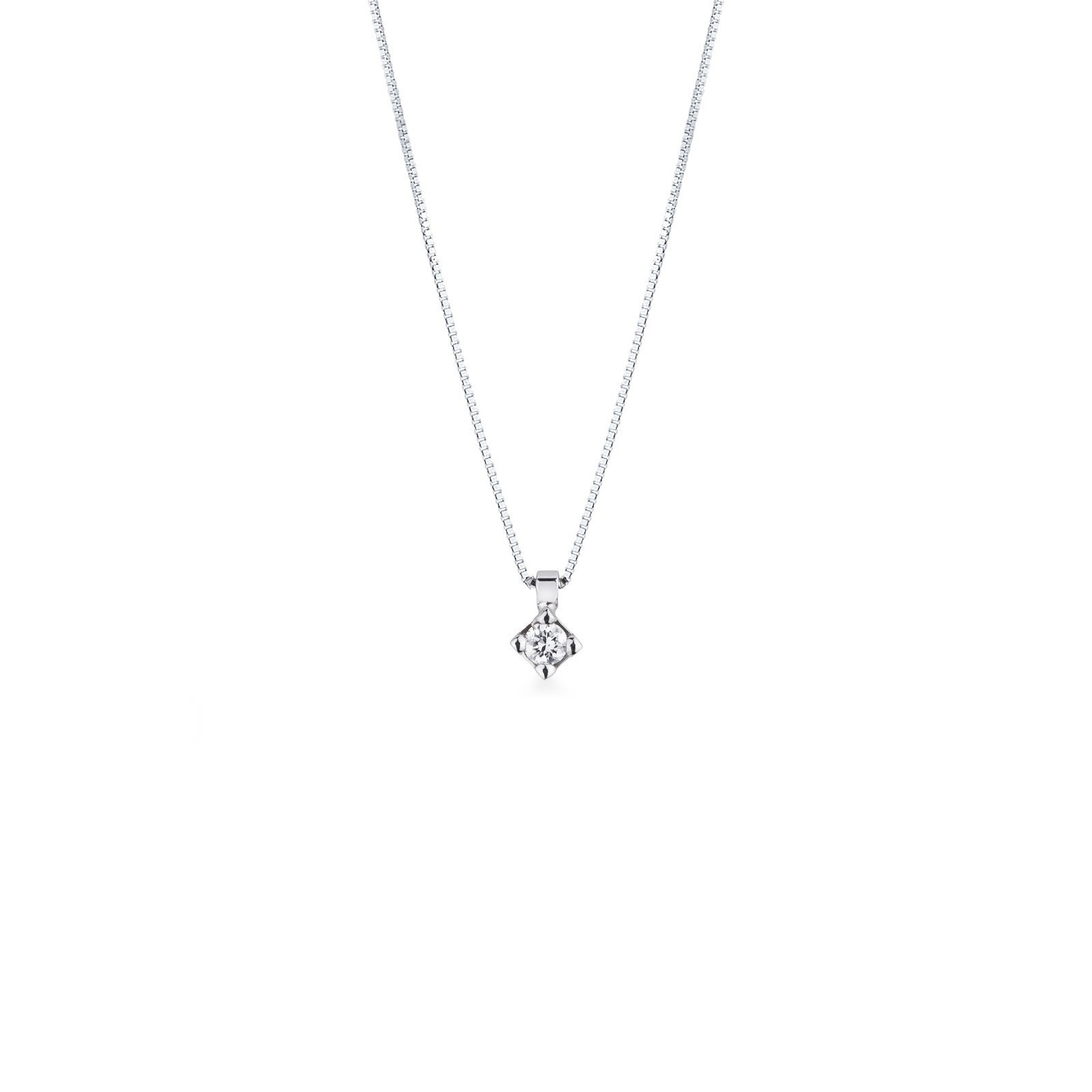 Collier point de lumière à cipollina en or blanc 18k, serti en son centre d’un diamant taille brillant, couleur H et pureté VS.
