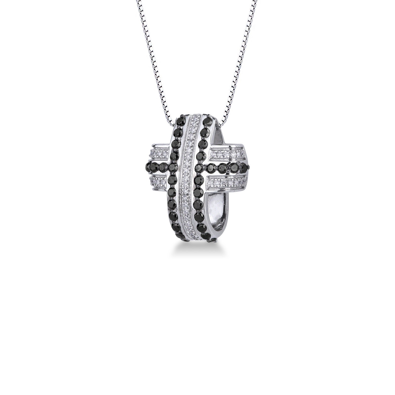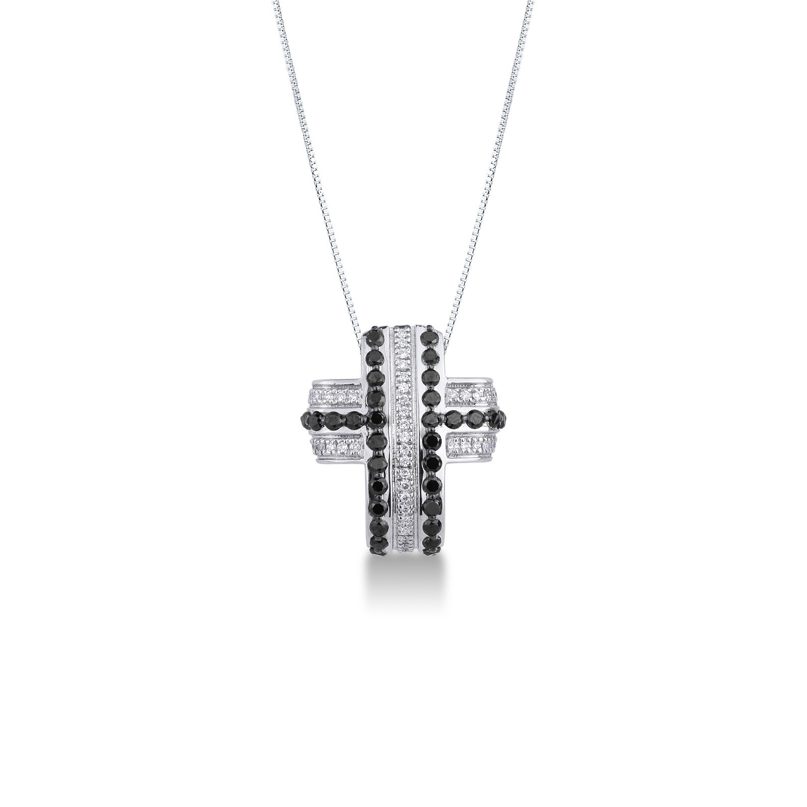 Collier avec croix bombée en or blanc 18k avec diamants blancs et noirs