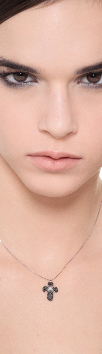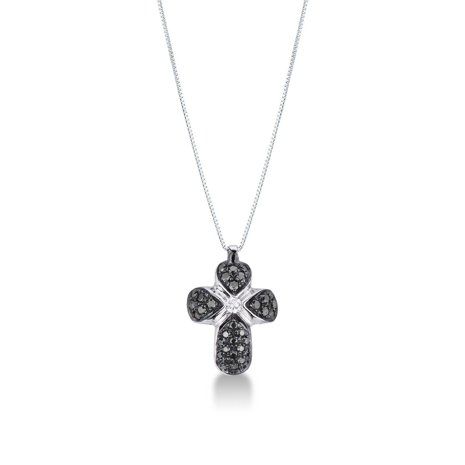 Collier avec croix bombée en or blanc 18k avec diamants noirs et diamant