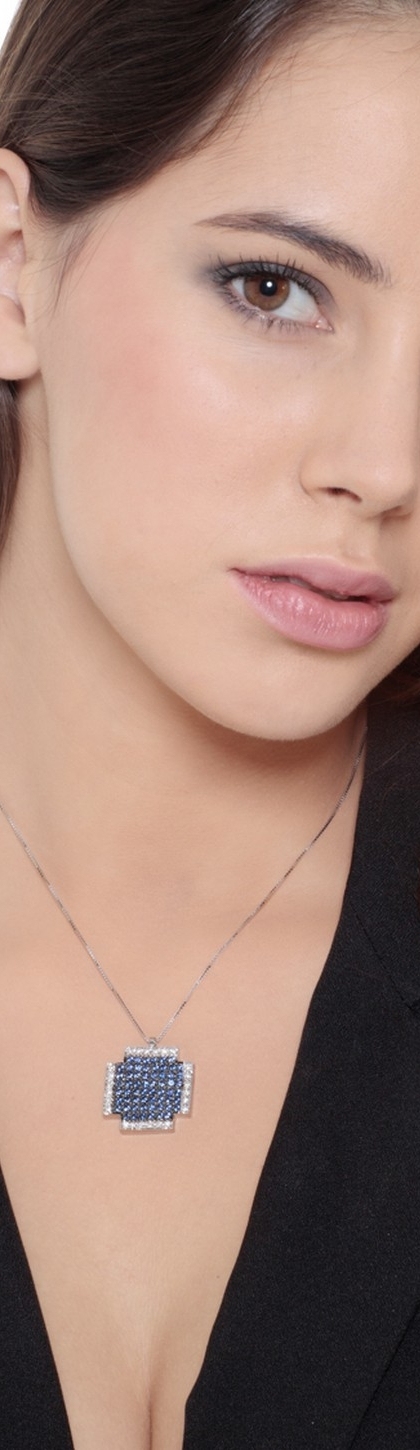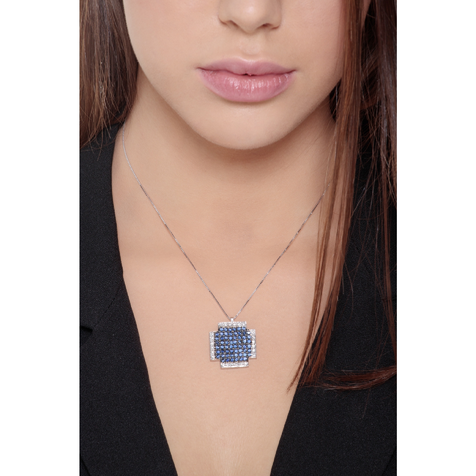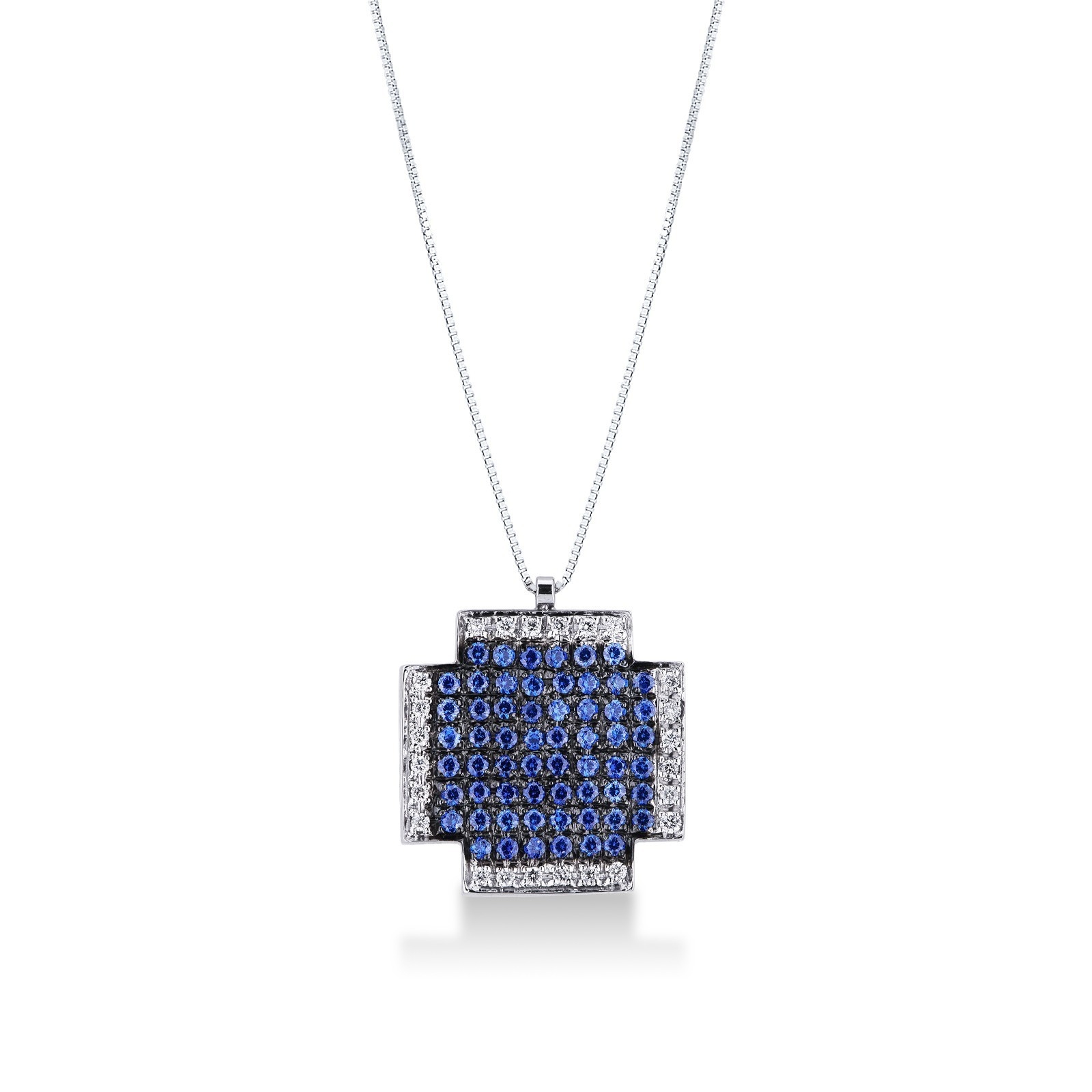 Collier en or blanc 18k avec croix carrée sertie de saphirs et diamants