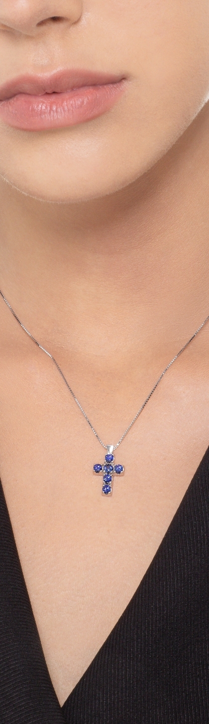 Pendentif en croix en or blanc 18 carats saphirs bleus