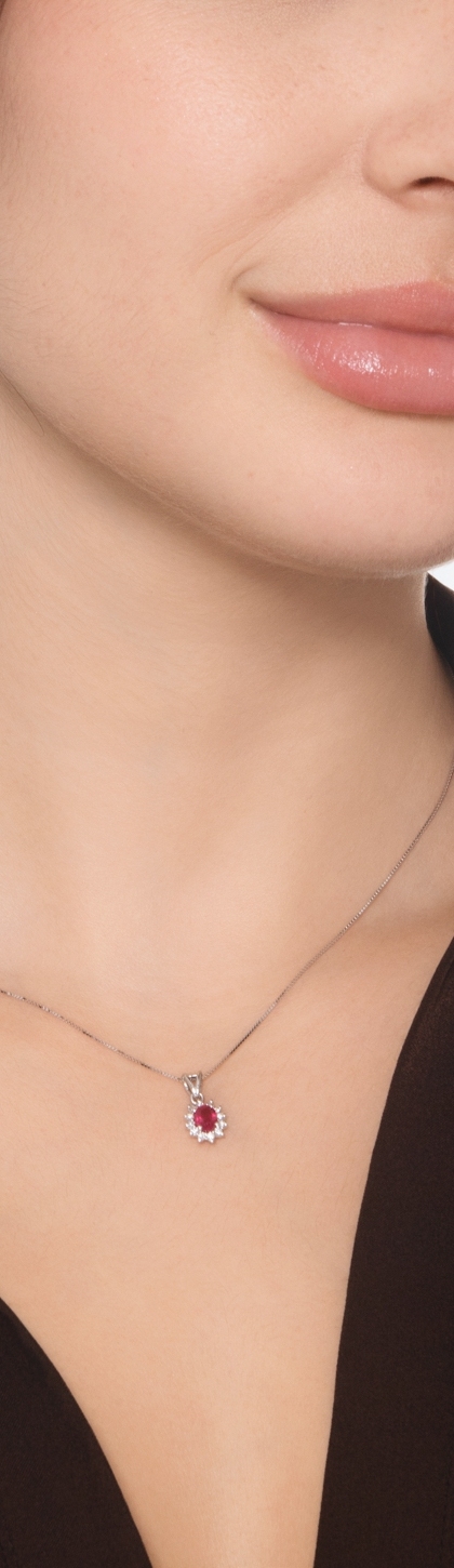 Élégant collier contourné en or blanc 18k avec rubis ovale central de 5x4 mm et diamants taille brillant, couleur H, pureté VS. Un bijou raffiné et lumineux, parfait pour toutes les occasions.