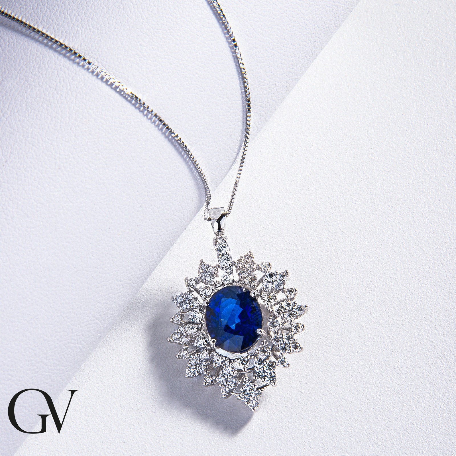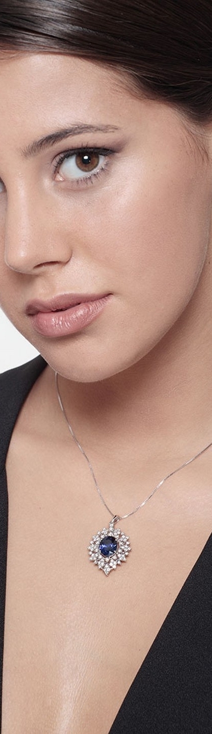 Collier design en or blanc 18k avec saphir bleu et diamants