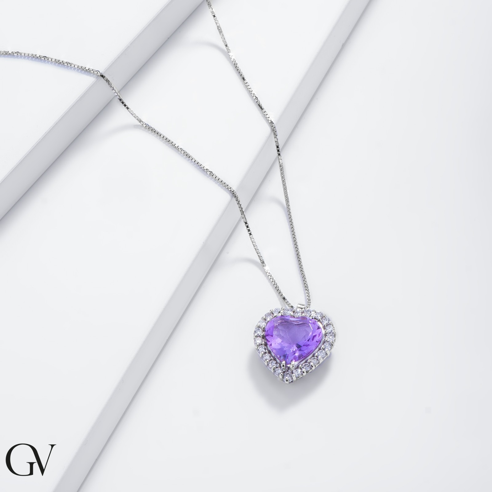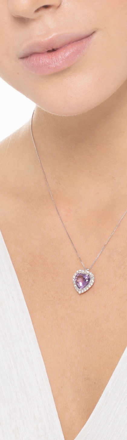 Collier en or blanc 18k avec cœur améthyste et diamants