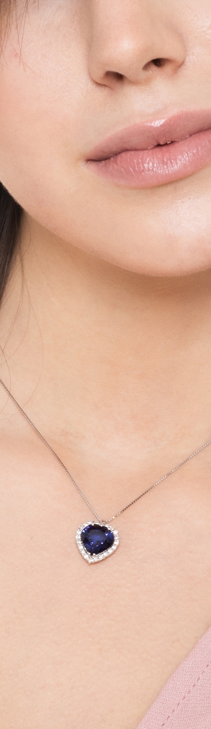 Collier en or blanc 18k avec cœur en diamants et saphir bleu