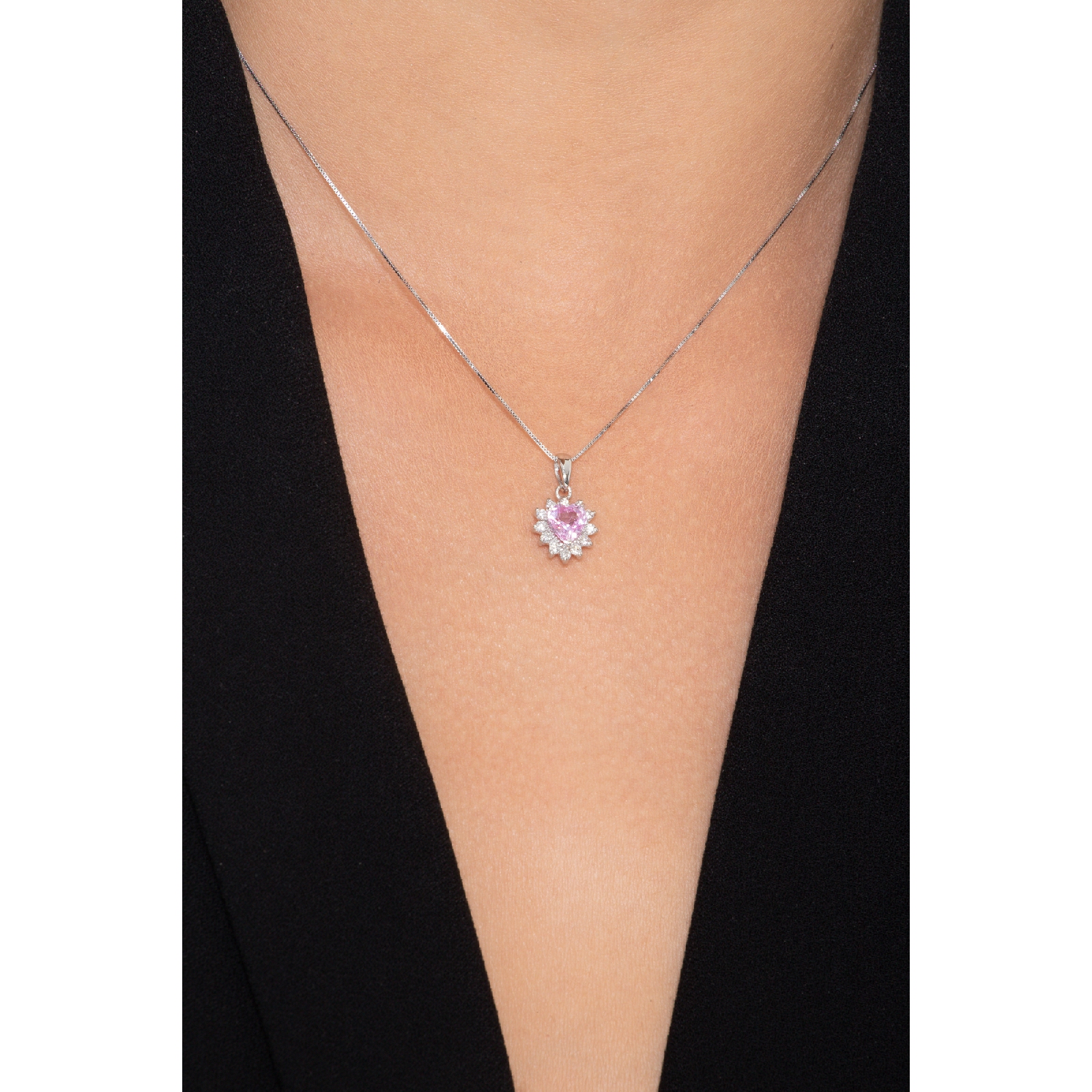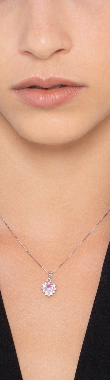 Collier en Or Blanc 18k avec Pendentif Cœur, Saphir Rose et Diamants