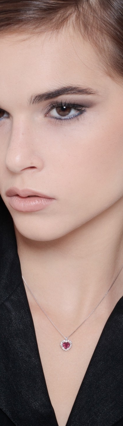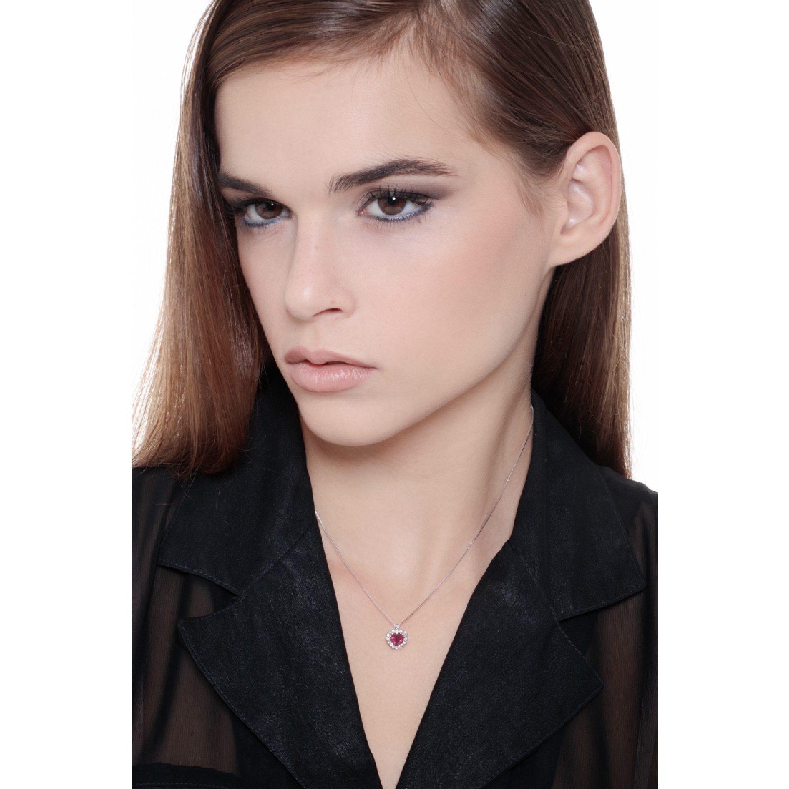 Collier en or blanc 18K avec rubis taille cœur d’environ 6 mm entouré de diamants