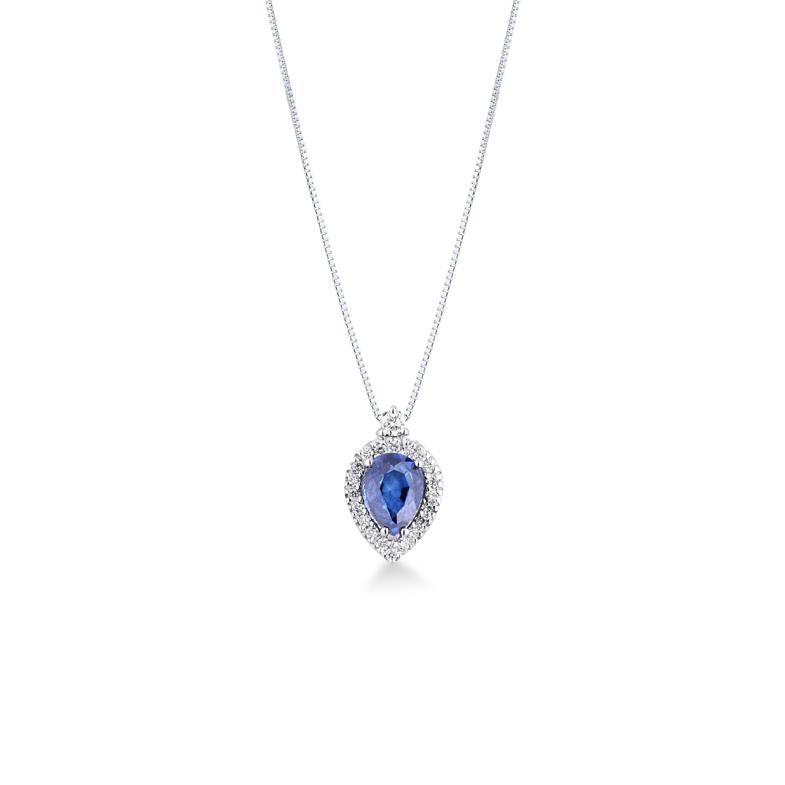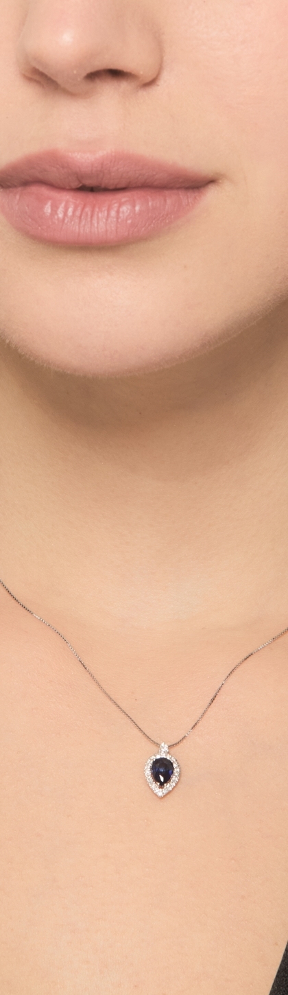Collier en or blanc 18k goutte en saphir bleu et halo de diamants
