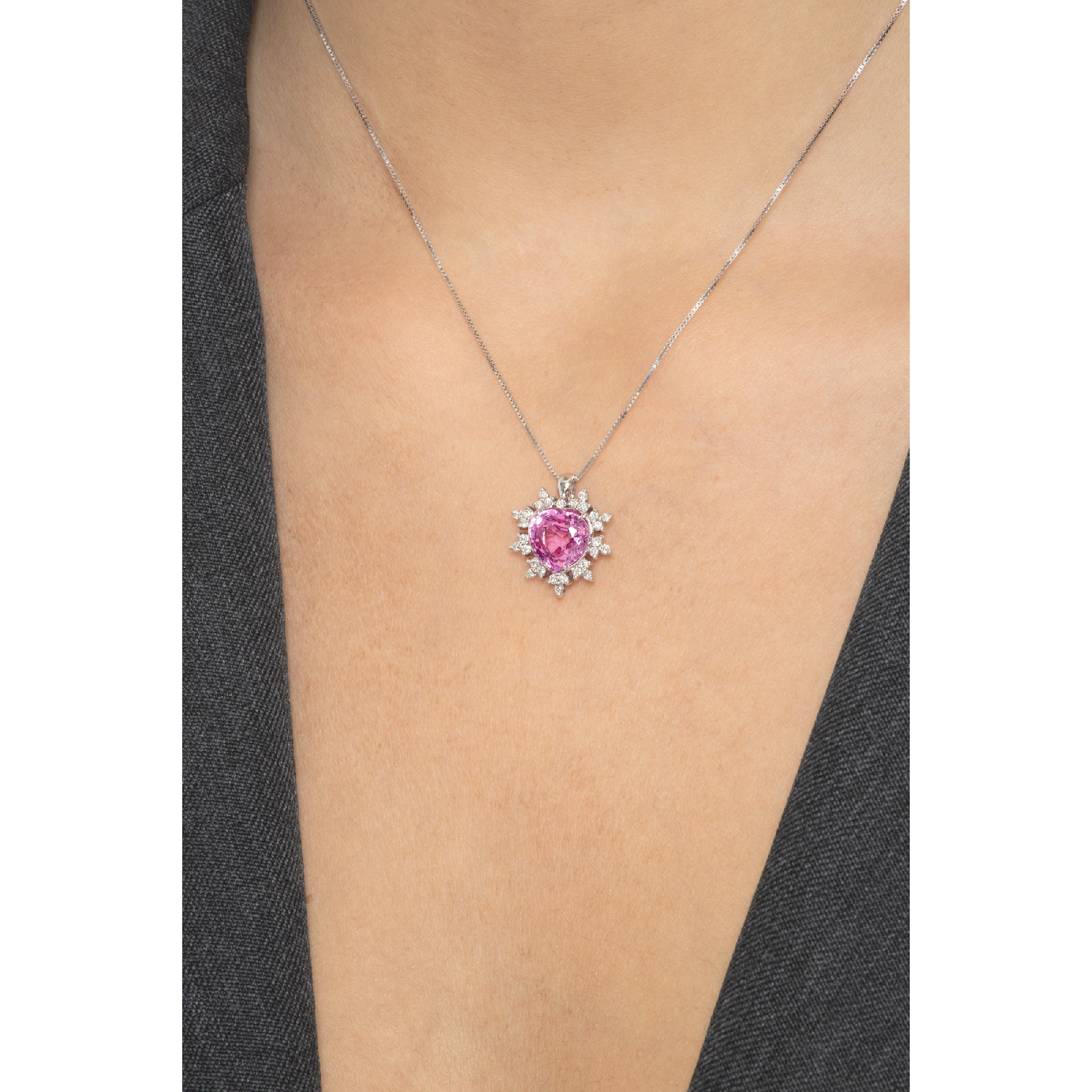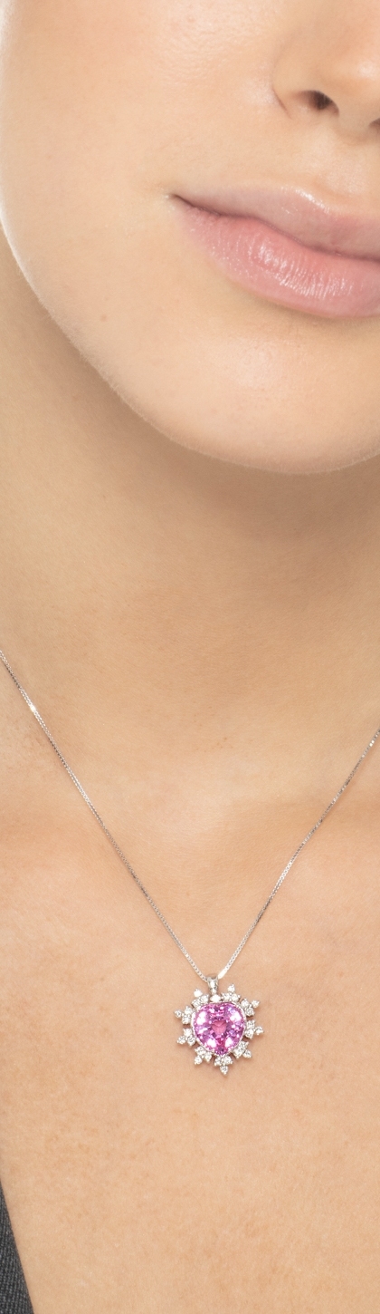 Collier or blanc 18k fleur saphir rose et pétales en diamants