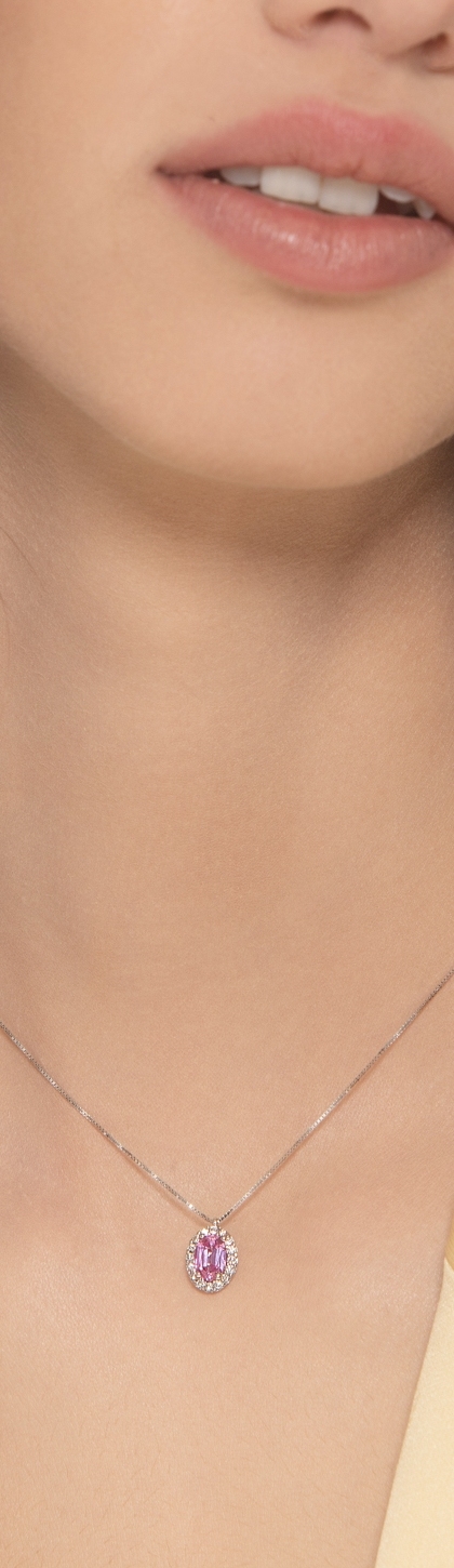 Collier saphir rose taille ovale entouré de diamants en or 750
