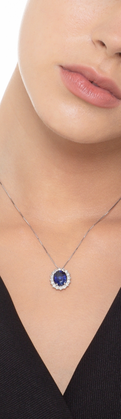Pendentif en or blanc 18 ct avec saphir bleu taille ovale et halo diamants