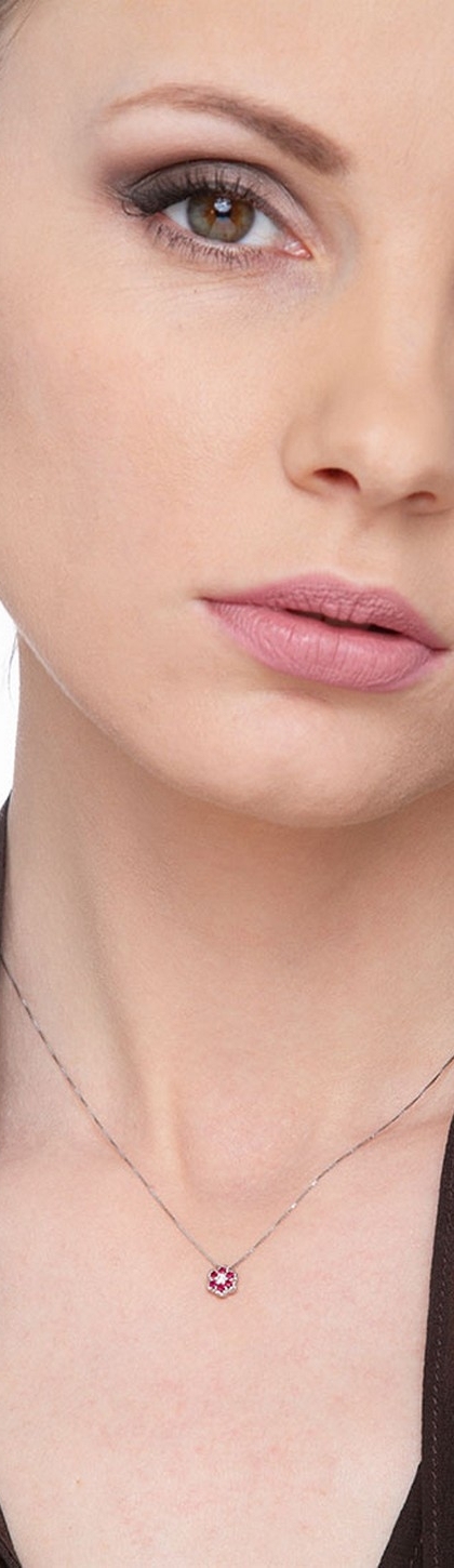 Collier en or blanc 18 carats avec pendentif en forme de fleur d’environ 6 mm de diametre. Diamant taille brillant, couleur H, purete VS, entoure de rubis taille brillant. Un bijou elegant qui sublime votre beaute avec une touche de couleur et d’eclat