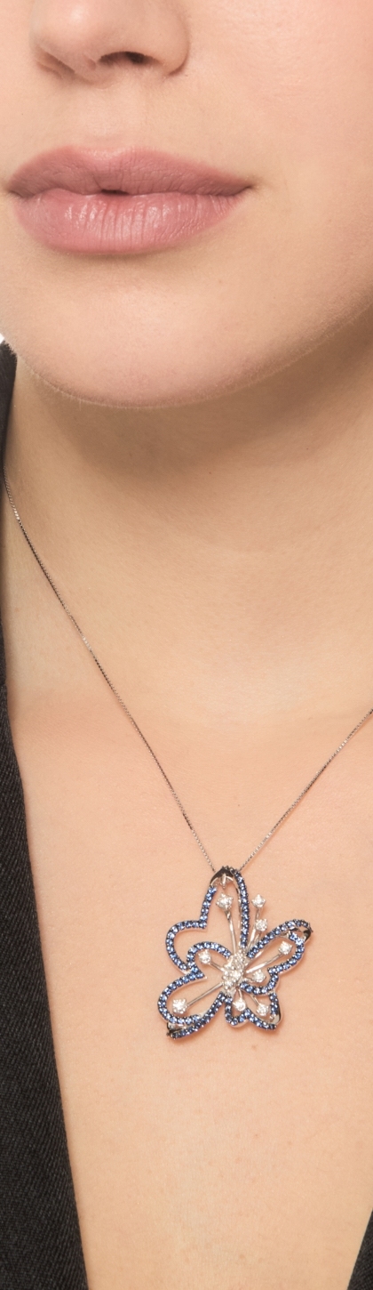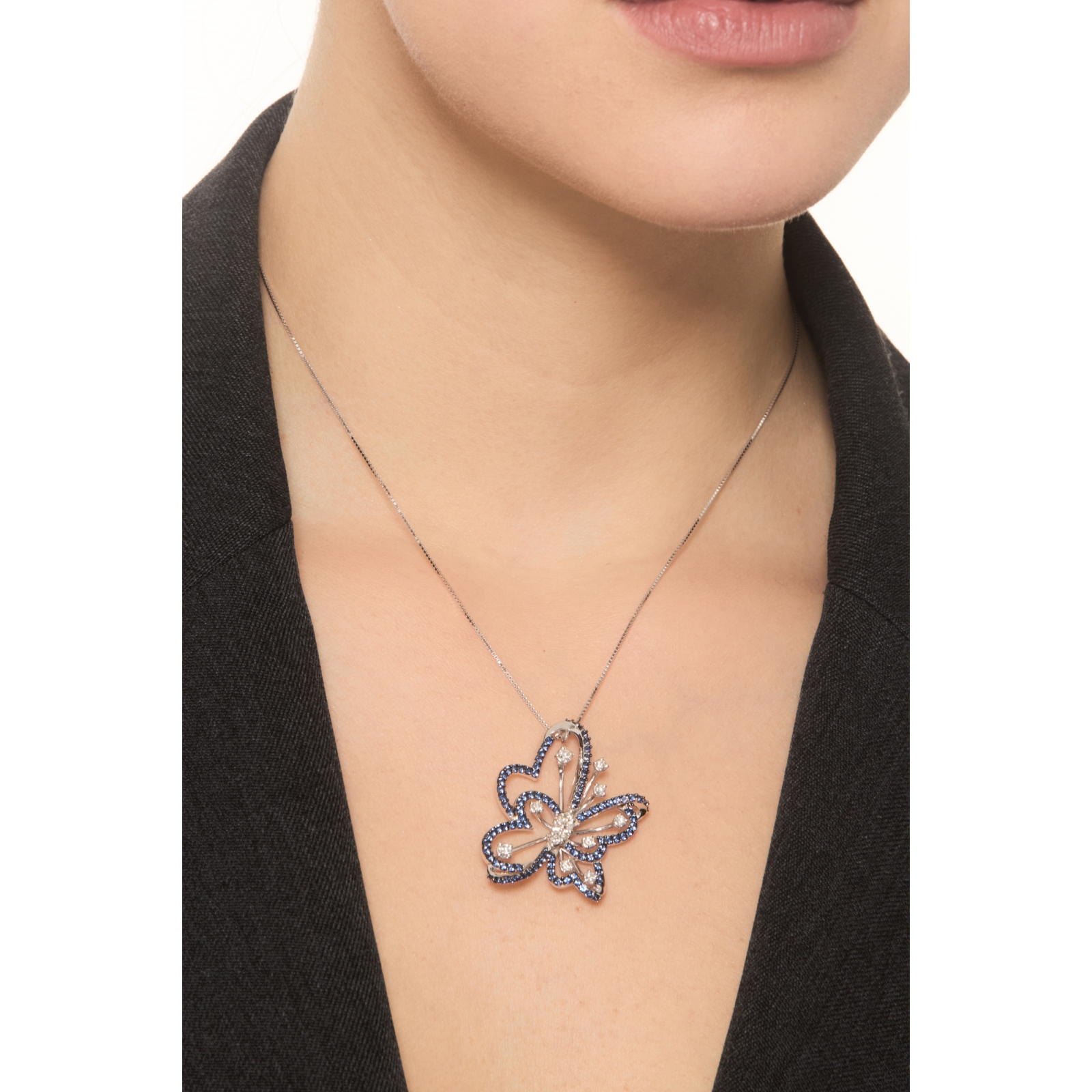 Collier design avec pendentif papillon en or blanc 18k orné de saphirs bleus