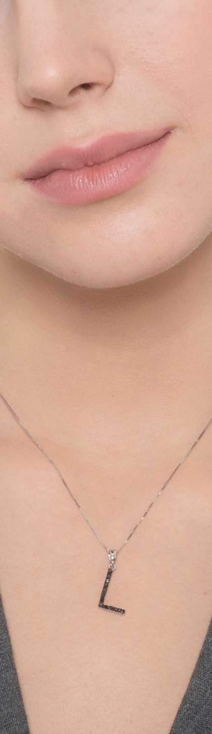 Collier en or blanc 18 carats avec pendentif lettre L gravée et diamants noirs