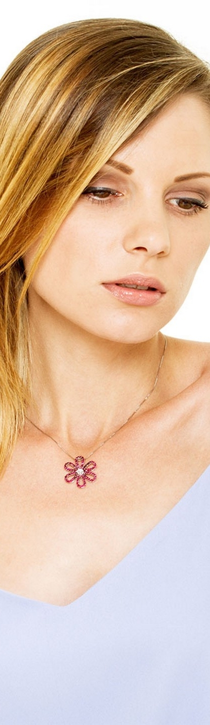 Collier en or blanc 18k avec pendentif fleur serti de rubis et diamants