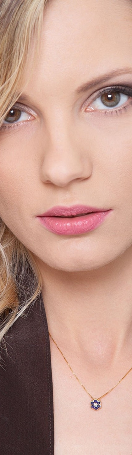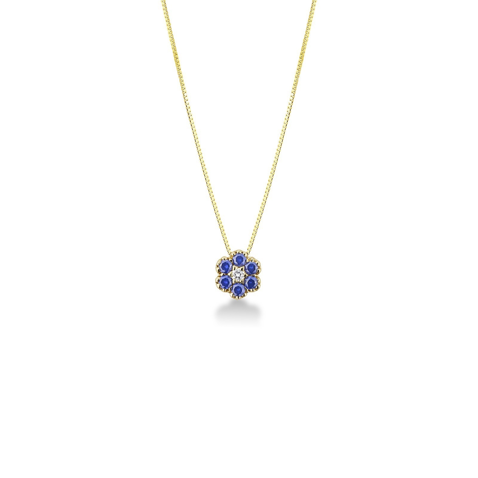 Collier en or jaune avec pendentif fleur, diamant et saphirs