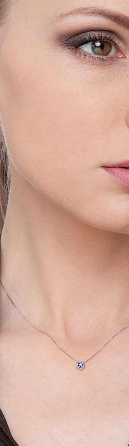 Collier en or blanc 18k avec pendentif en forme de fleur de 5 mm de diamètre, orné d’un diamant taille brillant entouré de saphirs bleus taille brillant. Un bijou délicat et élégant.