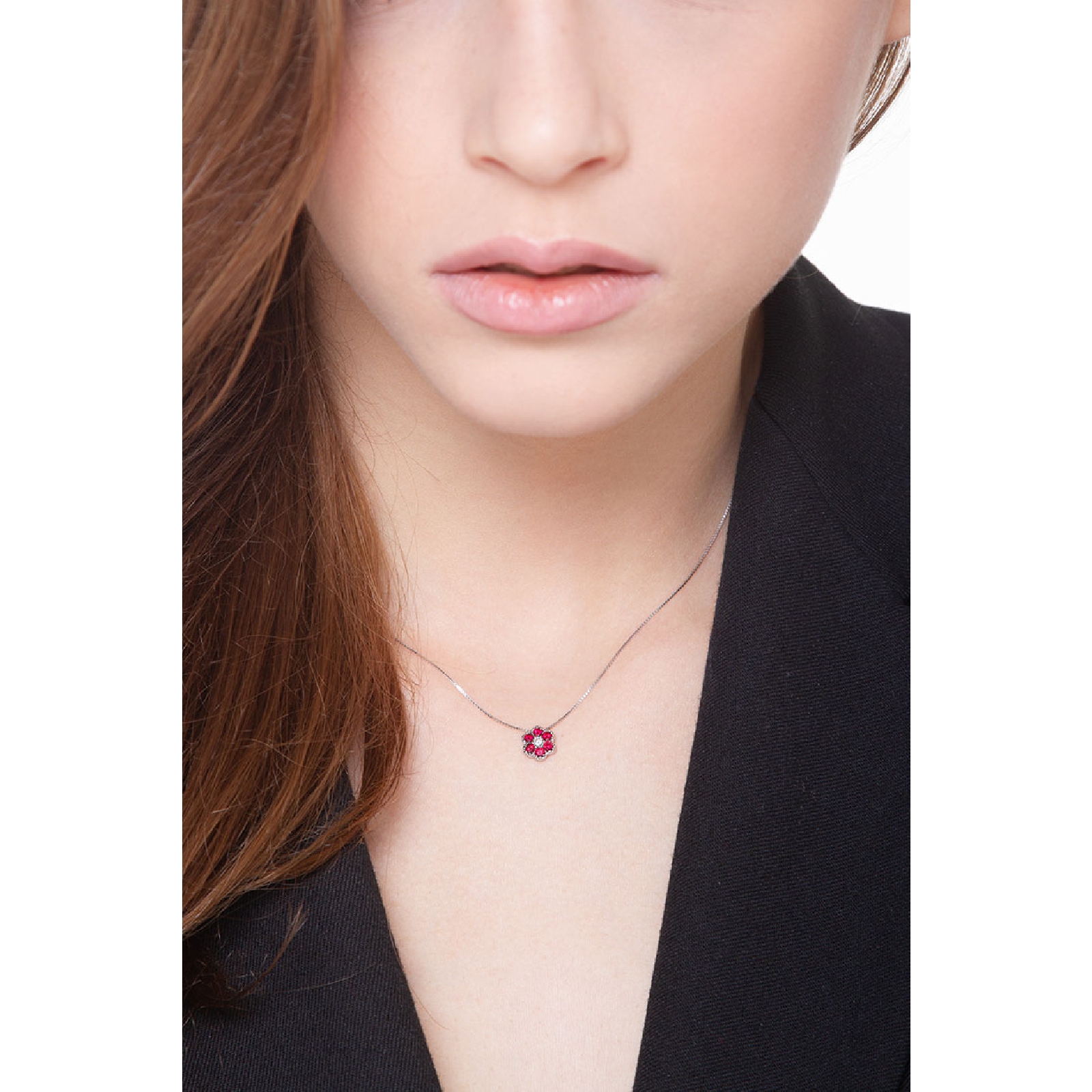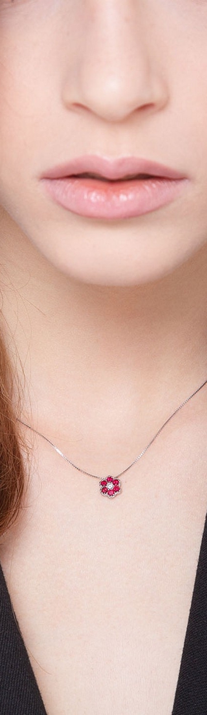 Collier fleur illusion en or blanc 18k avec diamant et rubis