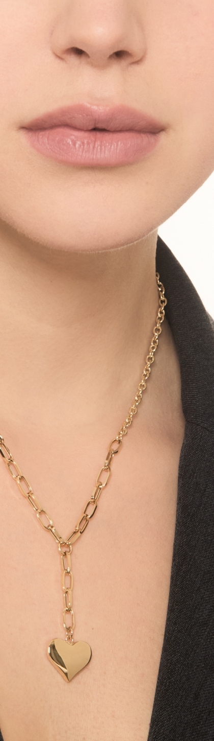 Collier en or jaune 18K avec pendentif cœur, maillons rolò et paperclip. Le pendentif mesure environ 1,48 x 1,68 cm.