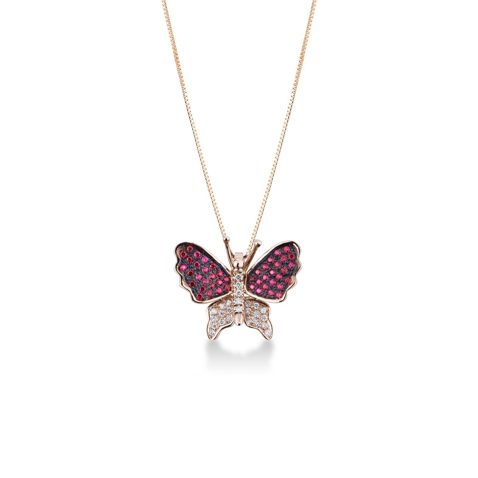 Collier pendentif papillon en or rose avec diamants et rubis