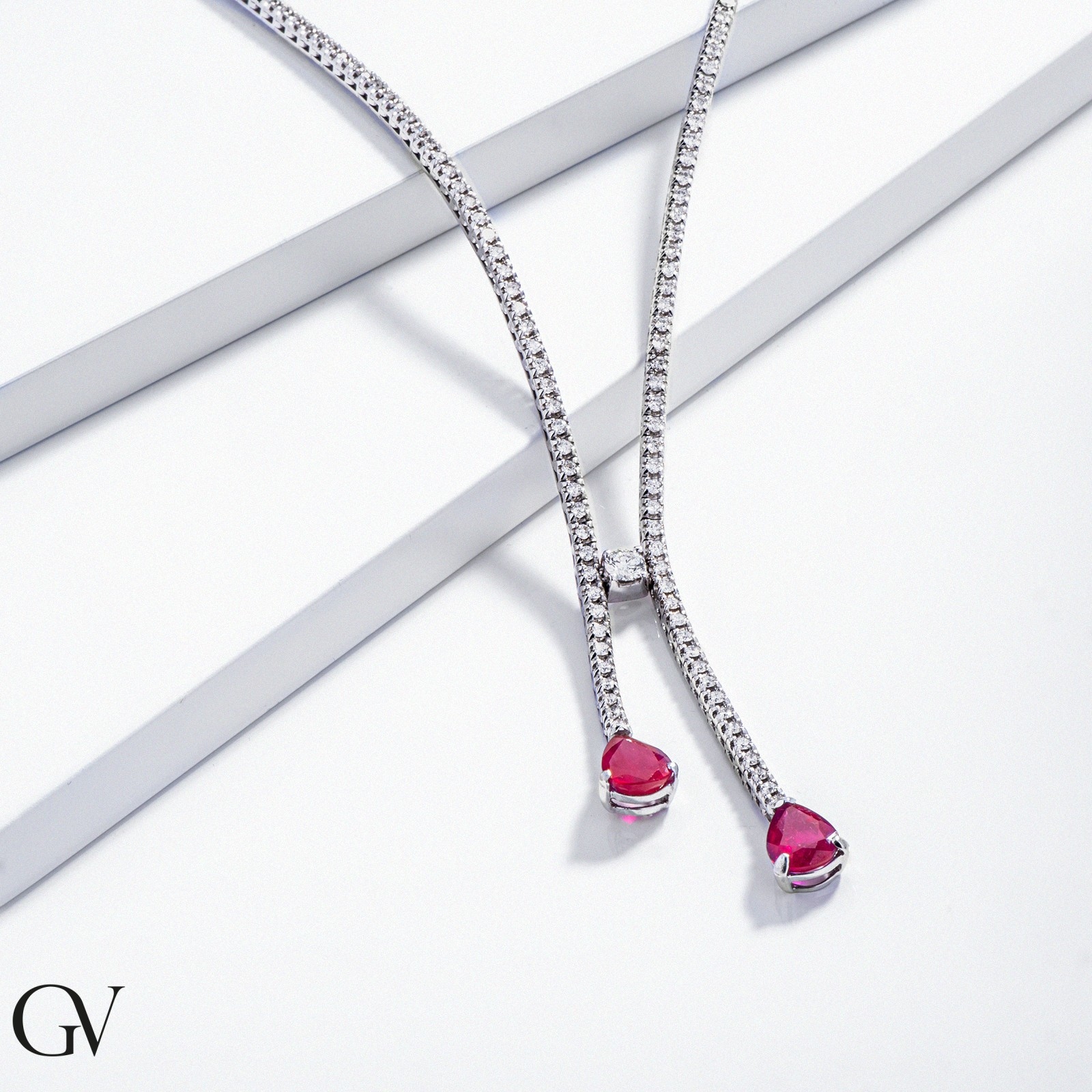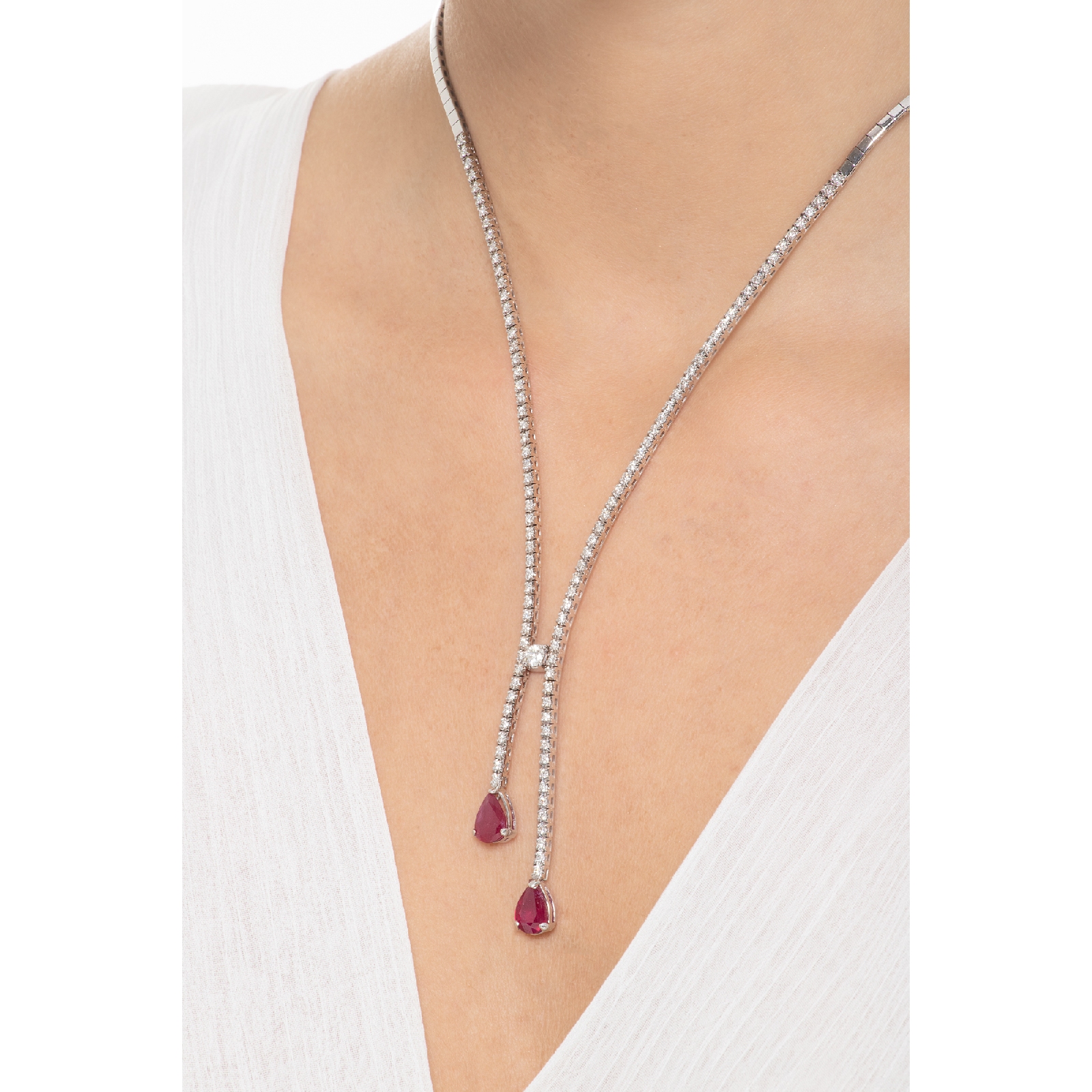 Collier tennis en or blanc 18k avec diamants et rubis goutte