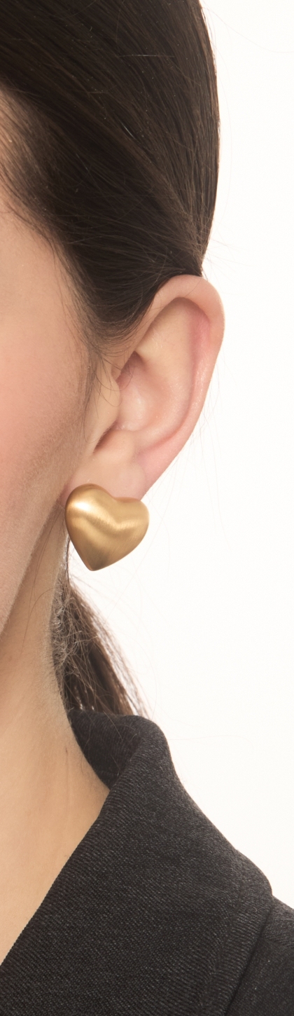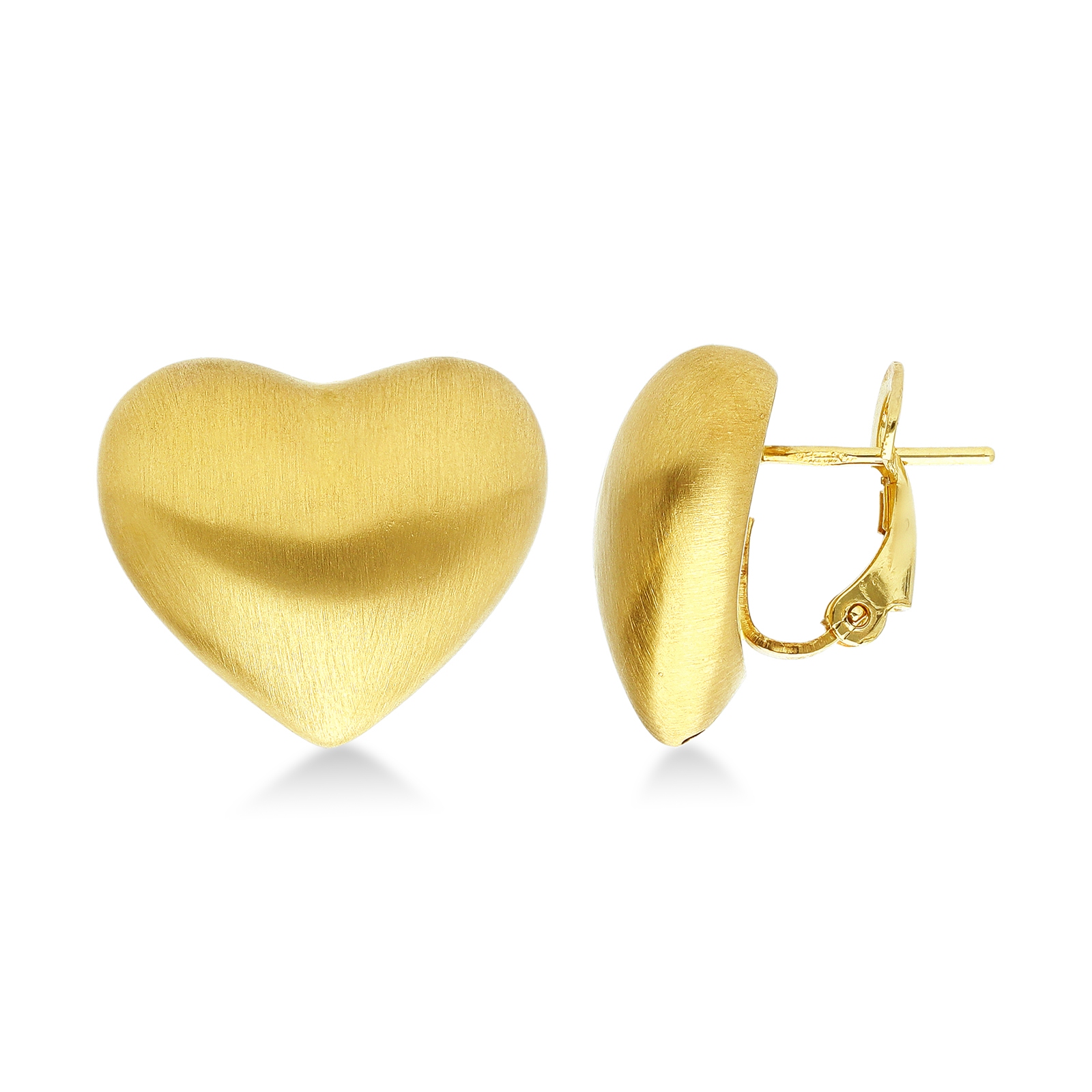 Boucles d'oreilles en or jaune 18K en forme de cœur satinés avec fermoir à clip et tige. Chaque boucle d'oreille mesure environ 1,7 x 2,0 cm.