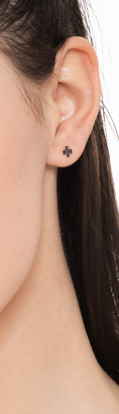 Puces d’oreilles en or rose 18 carats avec croix sertie de diamants noirs