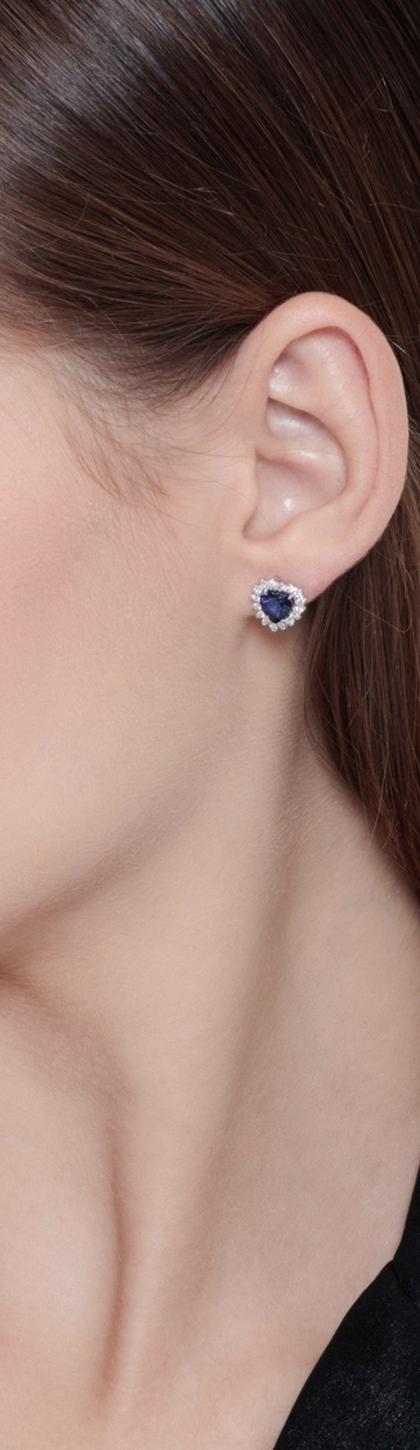 Boucles d'oreilles en or blanc 18 carats avec saphirs bleus à cœur halo diamants
