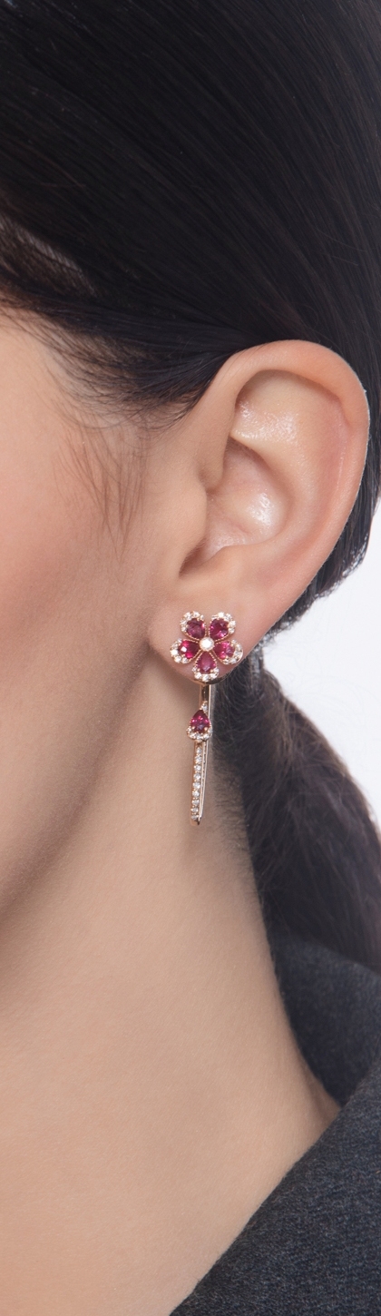 Boucles d’oreilles design en or rose avec fleur rubis et diamants