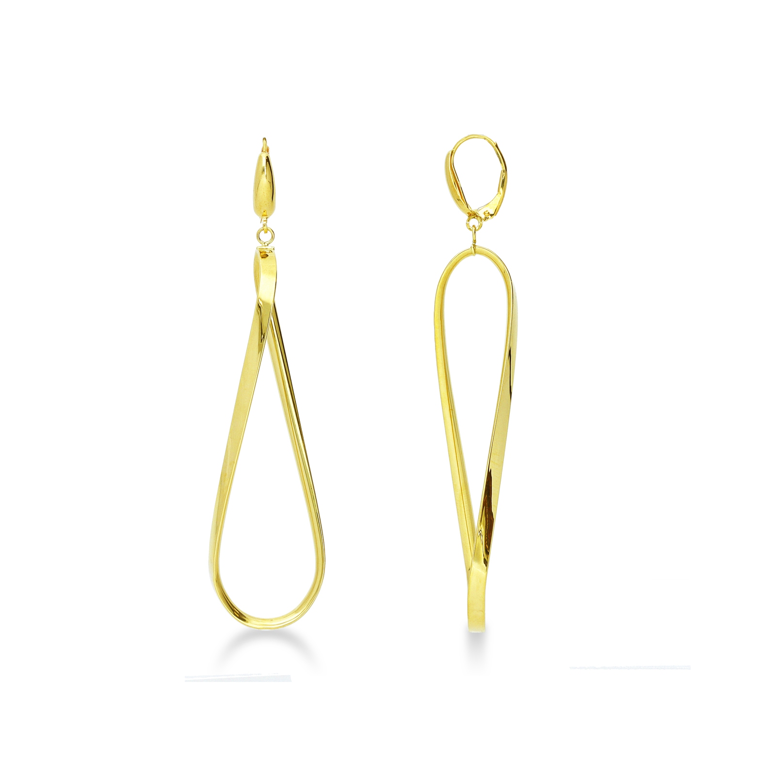 Boucles d’oreilles longues en or jaune 18 carats au design ovale et ondulé. Leur silhouette fluide de 8 cm capture la lumière avec grâce, ajoutant une touche d’élégance moderne et raffinée à chaque tenue.