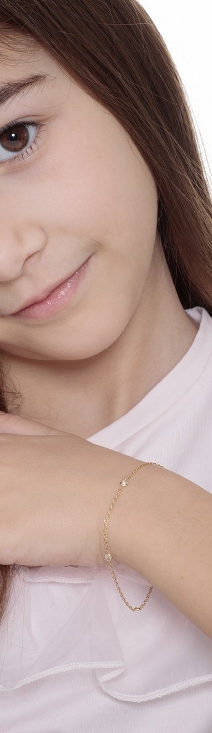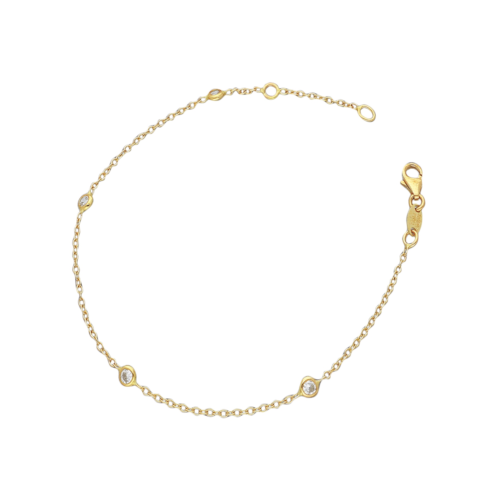 Bracelet pour femme en or jaune 18 carats, orné de quatre zircons scintillants. Son design fantaisie et sa longueur réglable en font un bijou confortable et raffiné, idéal pour être porté au quotidien ou lors d’occasions spéciales