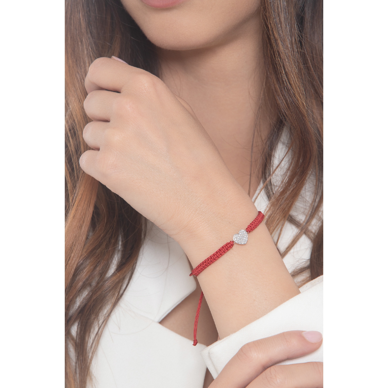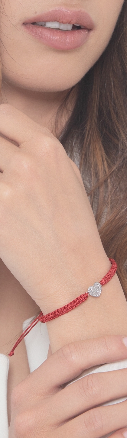 Bracelet cordon rouge avec cœur en or blanc 18k et diamants